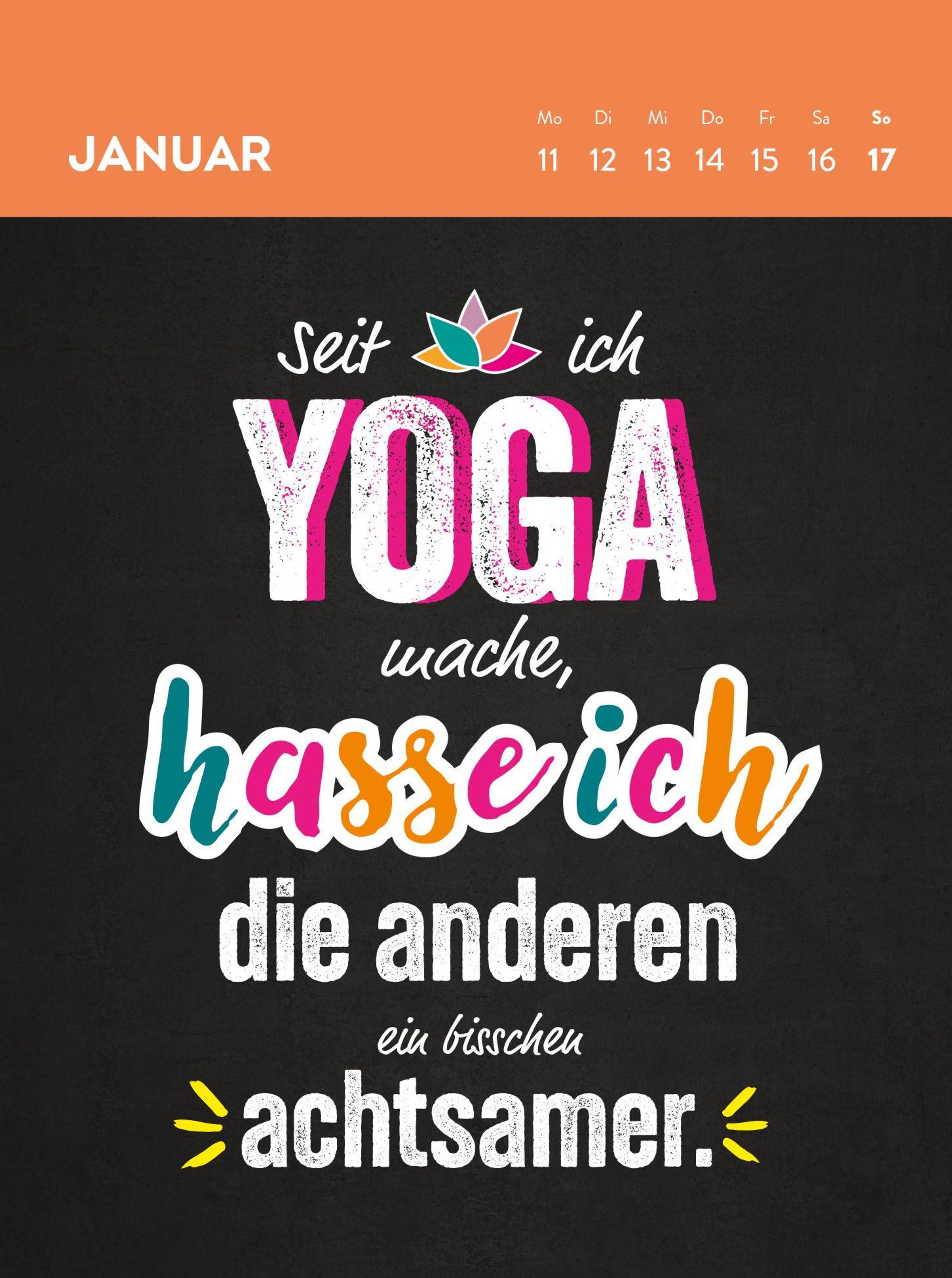 Der freche Wochenkalender Ich atme ein, ich raste aus 2027 weiß zum Beispiel: "Lächle - irgendjemandem wirst du damit den Tag versauen" und "Der Tag wird wieder anstrengend - also vor allem für die Leute um mich herum" ... Lustige Sprüche in knallig-bunter Gestaltung machen den Tischkalender 2027 zum idealen Begleiter im Büro, der immer wieder für einen Lacher sorgt. Dank des praktischen Hochformats findet der Sprüchekalender 2027 auf jedem Schreibtisch einen Platz. Der lustige Bürokalender 2027 ist ein humorvolles Geschenk für den Kollegen oder die Kollegin ebenso wie ein lustiges Weihnachtsgeschenk für die Freundin oder den Freund.