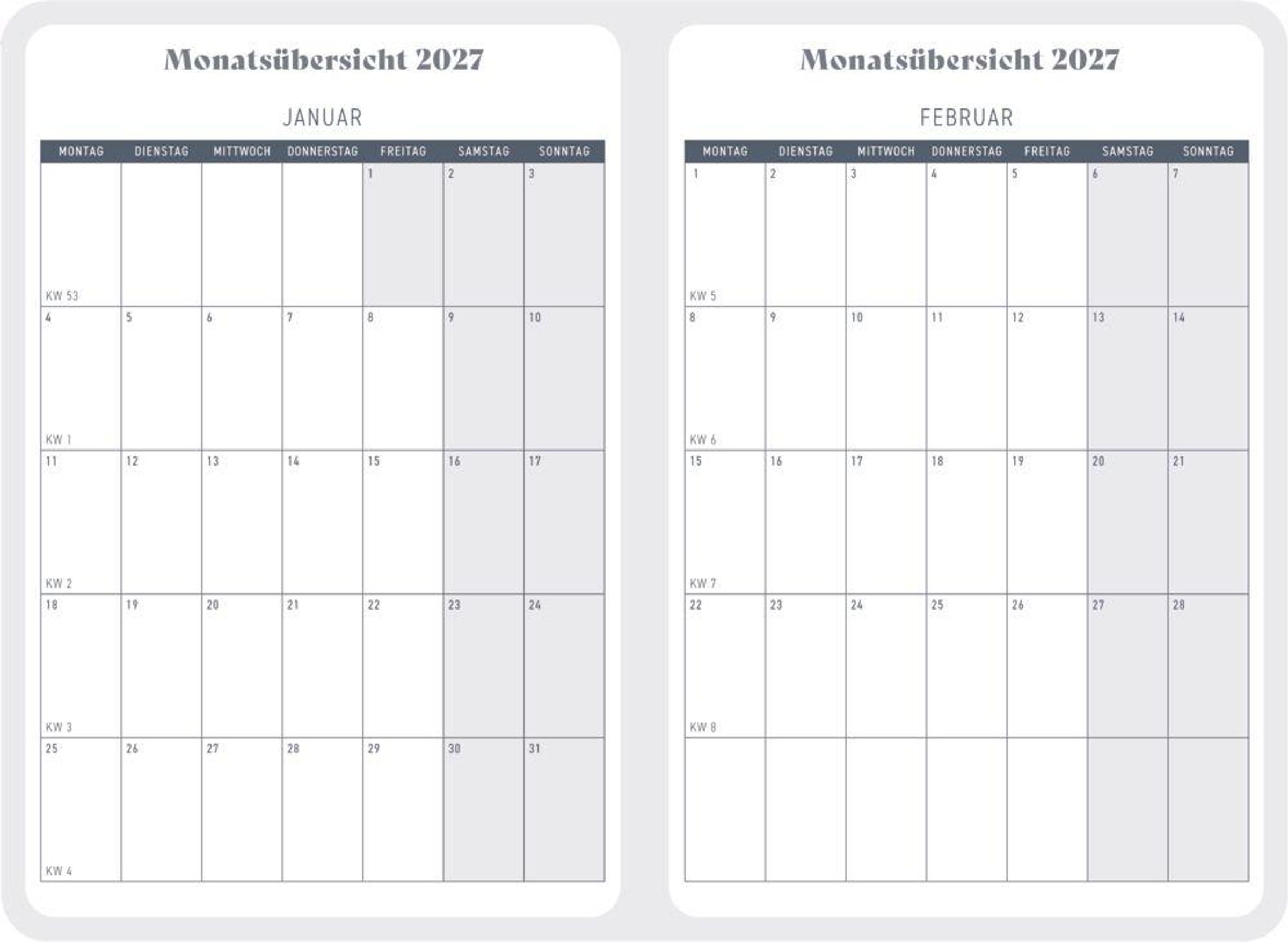 TERMINPLANER 2027: 112 Seiten im handlichen Format HOCHWERTIGE QUALITÄT: Gut aufklappbares Hardcover, Gummiband, Leseband, farbig gestaltete Innenseiten sowie Cover mit Goldfolie DEIN GLÜCKSTAGEBUCH: Auf den modern gestalteten Wochenseiten kannst du täglich deine Stimmung sowie deinen Glücksmoment festhalten und deine Woche reflektieren EXKLUSIVER INHALT: Mit Sternzeichen, Mondphasen und einer Auswahl an Feiertagen verschiedener Religionen BESONDERES GESCHENK: Durch die hochwertige Ausstattung ist dieser Tagesplaner das perfekte Geschenk für mehr Achtsamkeit im Alltag