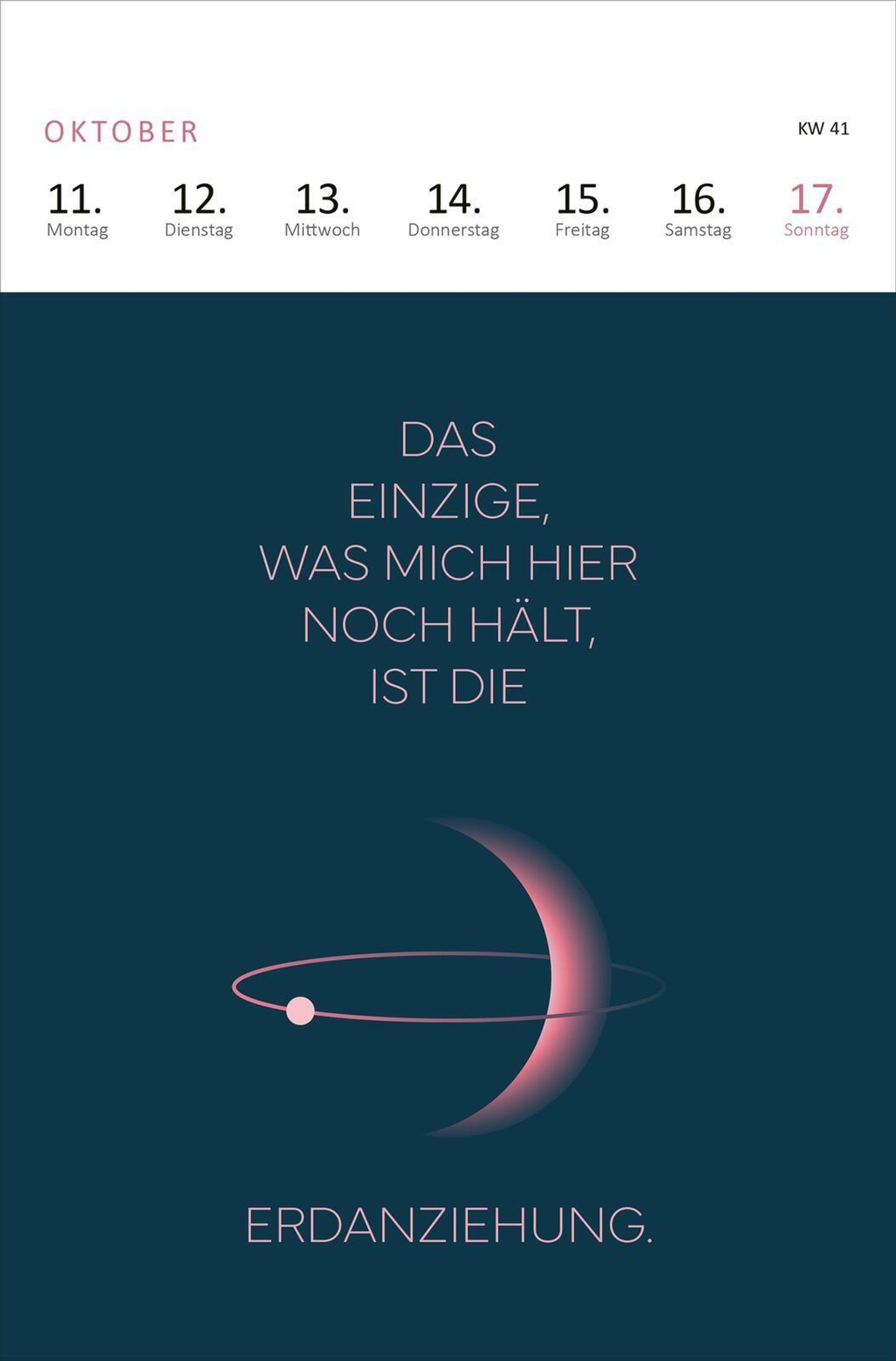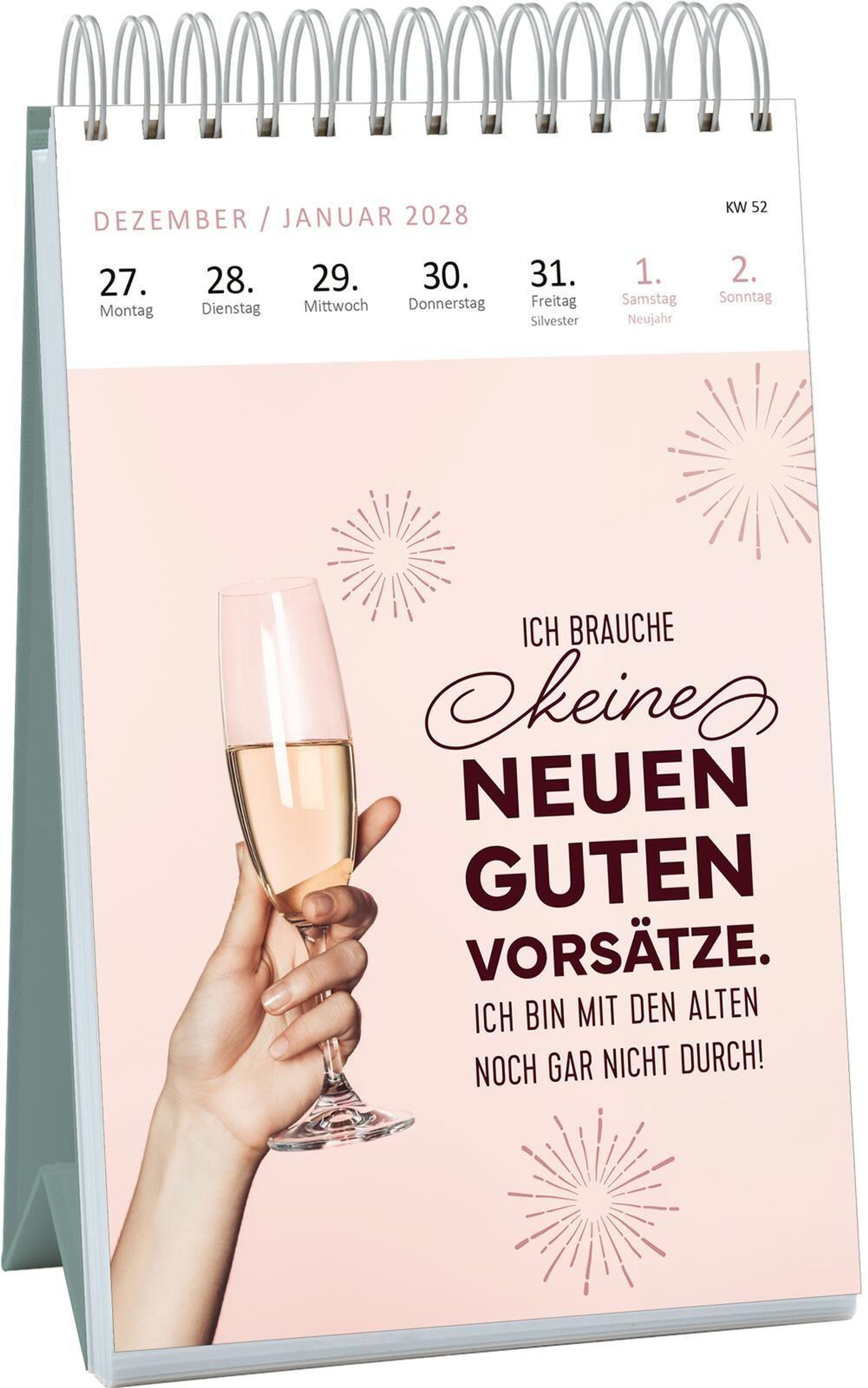 Ein wunderbares Geschenk für alle, die 2027 mit Leichtigkeit und Humor starten wollen. Dieser Aufstellkalender mit bösen Sprüchen, hochwertigen Fotografien und kunstvollen Illustrationen schenkt dabei an jedem Tag eine neue Prise Witz und kleine Glücksmomente. Das praktische Wochenkalendarium bietet einen guten Überblick über die Woche im Büro, Homeoffice oder zu Hause. Das Hochformat bringt die Typografie ideal zur Geltung und der Kalender lädt dazu ein, neben allen To-dos jeden Tag bewusst zu genießen.