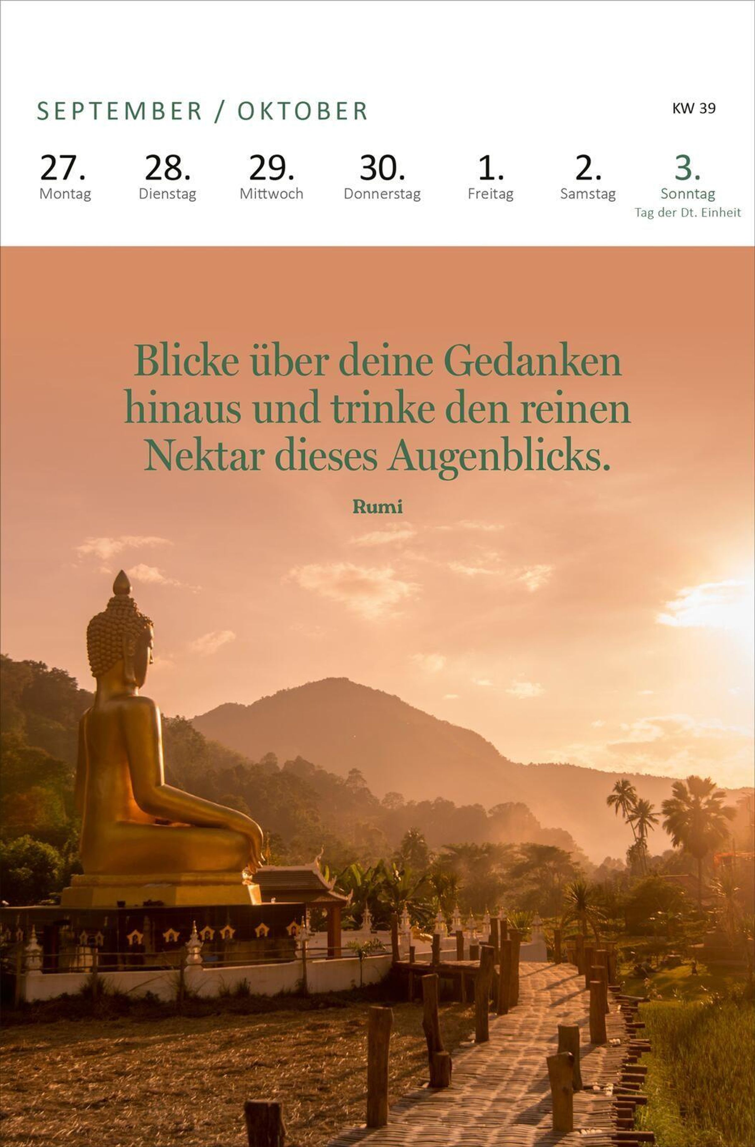 Ein wunderbares Geschenk für alle, die 2027 achtsam leben möchten und positive Affirmationen aus dem Bereich Yoga für ihren Alltag suchen. Dieser Aufstellkalender mit hochwertigen Fotografien und kunstvollen Illustrationen schenkt dabei an jedem Tag neue Kraft und Inspiration und ist eine Kraftquelle für die Seele. Jede Woche finden sich nach dem Umblättern ein paar schöne Yoga- und Achtsamkeitsimpulse, die durch den Tag begleiten. Das praktische Wochenkalendarium bietet einen guten Überblick über die Woche im Büro, Homeoffice oder zu Hause. Das Hochformat bringt die Zeichnungen ideal zur Geltung und sie laden dazu ein, neben allen To-dos jeden Tag bewusst zu genießen.