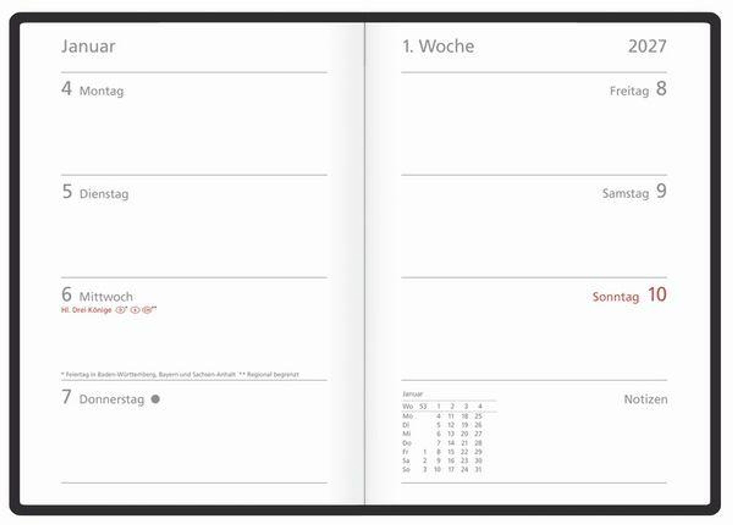 - Praktische Wochenübersicht; Jede Kalenderwoche übersichtlich auf einer Doppelseite