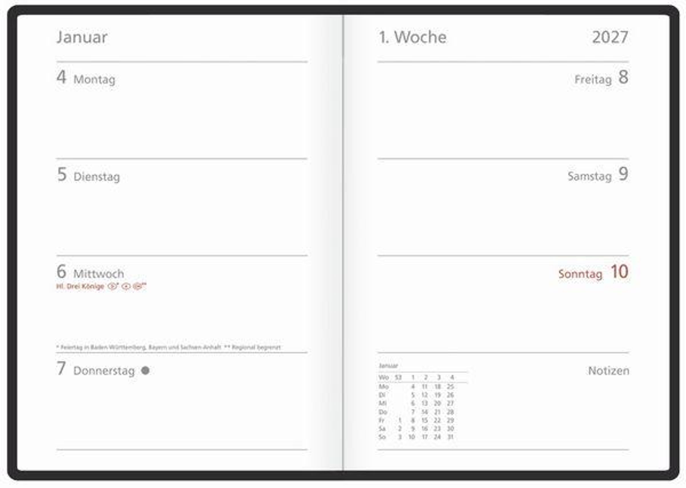 - Praktische Wochenübersicht; Jede Kalenderwoche übersichtlich auf einer Doppelseite