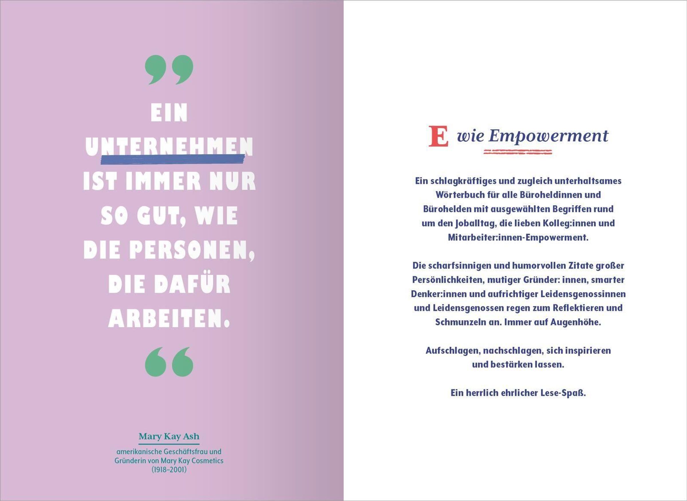 Du bist auf der Suche nach einem besonderen Geschenk für Kolleginnen und Kollegen, Berufseinsteiger oder Freunde? Dann ist dieses einzigartige Lexikon genau das Richtige für dich! Das Büro-Wörterbuch veranschaulicht ausgewählte Begriffe rund um den Arbeitsplatz, den Joballtag, die lieben Kolleginnen und Kollegen, Urlaub, Freizeit, kleine Rückschritte und den Erfolg. Es versammelt kluge und humorvolle Zitate erfahrener Geschäftsfrauen und Geschäftsmänner, großer Persönlichkeiten, mutiger Gründer: innen, smarter Denker: innen und aufrichtiger Leidensgenossinnen und -genossen. Fachbegriffe wie Empowerment oder Volltischler werden ebenso kurz und knackig definiert wie Begriffe aus dem Joballtag und der Bürosprache - mit pointierten Sprüchen und Zitaten untermalt. Ein originelles Lesevergnügen für alle Büroheldinnen und -helden mit der perfekten Mischung aus Motivation und Humor. Ganz nach dem Motto: "Ein bisschen mehr Ernsttäterätäteuns gut."