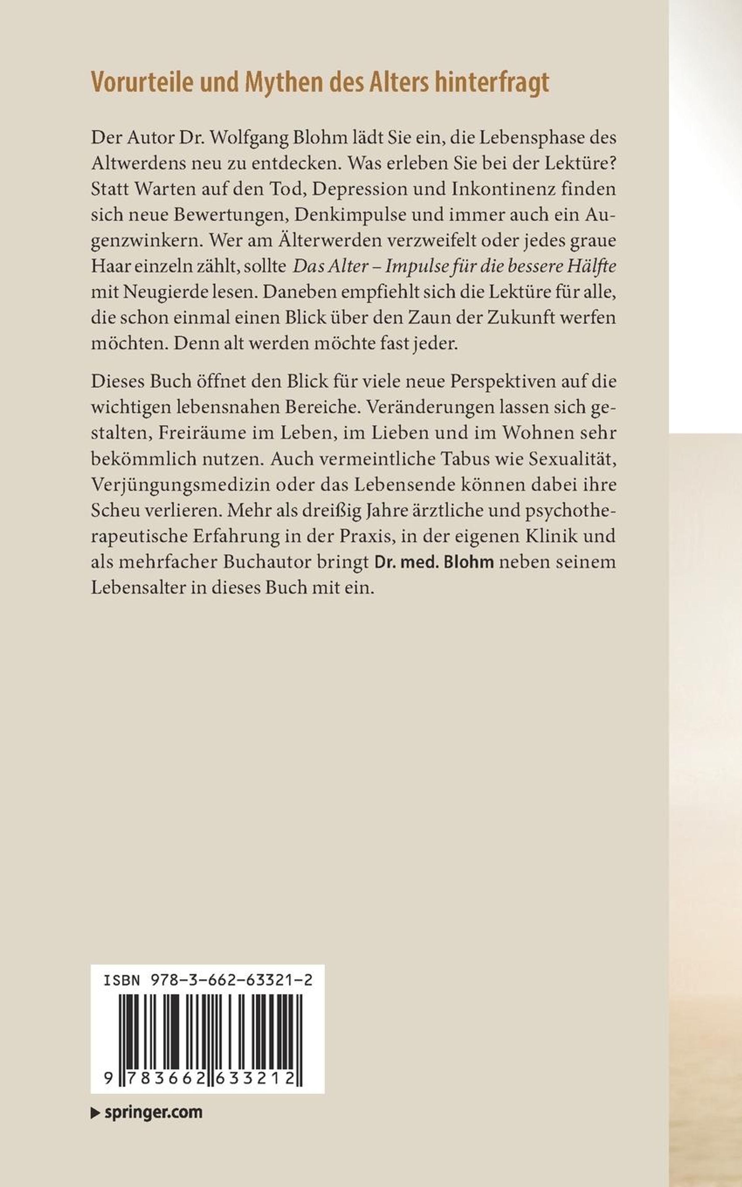 Vorurteile und Mythen des Alters hinterfragt: Der Autor Dr. Wolfgang Blohm lädt Sie ein, die Lebensphase des Altwerdens neu zu entdecken. Was erleben Sie bei der Lektüre? Statt Warten auf den Tod, Depression und Inkontinenz finden sich neue Bewertungen, Denkimpulse und immer auch ein Augenzwinkern. Wer am Älterwerden verzweifelt oder jedes graue Haar einzeln zählt, sollte ¿Das Alter ¿ Impulse für die bessere Hälfte¿ mit Neugierde lesen. Daneben empfiehlt sich die Lektüre für alle, die schon einmal einen Blick über den Zaun der Zukunft werfen möchten. Denn alt werden möchte fast jeder.