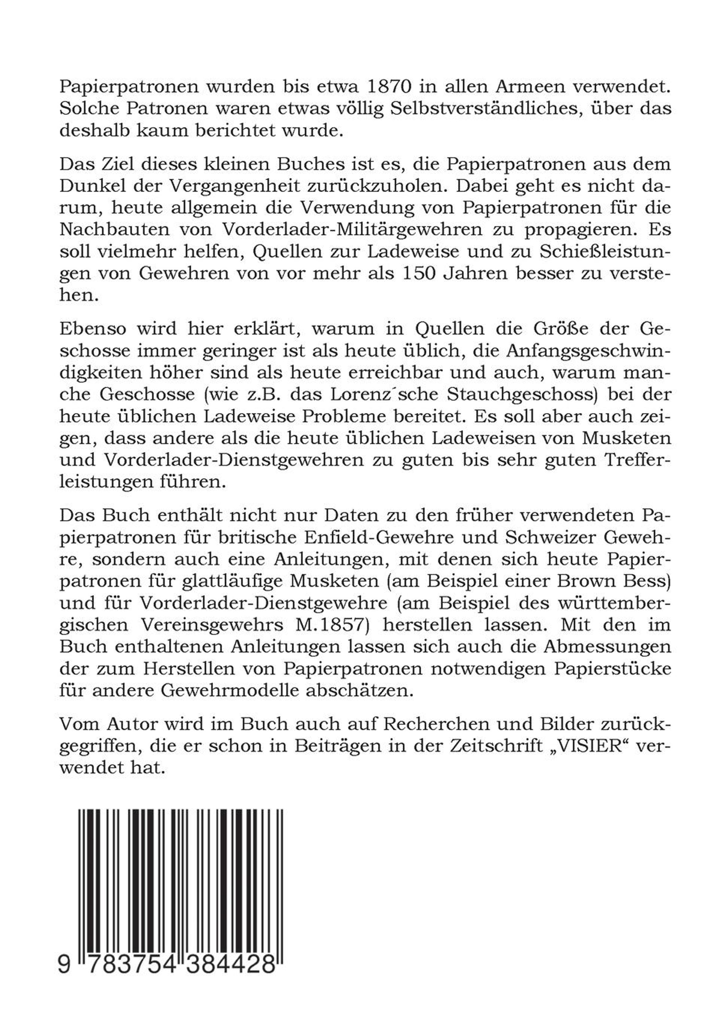 Papierpatronen wurden bis etwa 1870 in allen Armeen verwendet. Solche Patronen waren etwas völlig Selbstverständliches, über das deshalb kaum berichtet wurde. Das Ziel dieses kleinen Buches ist es, die Papierpatronen aus dem Dunkel der Vergangenheit zurückzuholen. Dabei geht es nicht darum, heute allgemein die Verwendung von Papierpatronen für die Nachbauten von Vorderlader-Militärgewehren zu propagieren. Es soll vielmehr helfen, Quellen zur Ladeweise und zu Schießleistungen von Gewehren von vor mehr als 150 Jahren besser zu verstehen. Ebenso wird hier erklärt, warum in Quellen die Größe der Geschosse immer geringer ist als heute üblich, die Anfangsgeschwindigkeiten höher sind als heute erreichbar und auch, warum manche Geschosse (wie z. B. das Stauchgeschoss von Lorenz) bei der heute üblichen Ladeweise Probleme bereitet. Es soll aber auch zeigen, dass andere als die heute üblichen Ladeweisen von Musketen und Vorderlader-Dienstgewehren zu guten bis sehr guten Trefferleistungen führen. Das Buch enthält nicht nur Daten zu den früher verwendeten Papierpatronen für britische Enfield-Gewehre und Schweizer Gewehre, sondern auch eine Anleitungen, mit denen sich heute Papierpatronen für glattläufige Musketen (am Beispiel einer Brown Bess) und für Vorderlader-Dienstgewehre (am Beispiel des württembergischen Vereinsgewehrs M. 1857) herstellen lassen. Mit den im Buch enthaltenen Anleitungen lassen sich auch die Abmessungen der zum Herstellen von Papierpatronen notwendigen Papierstücke für andere Gewehrmodelle abschätzen. Vom Autor wird im Buch auch auf Recherchen und Bilder zurückgegriffen, die er schon in Beiträgen in der Zeitschrift VISIER verwendet hat.