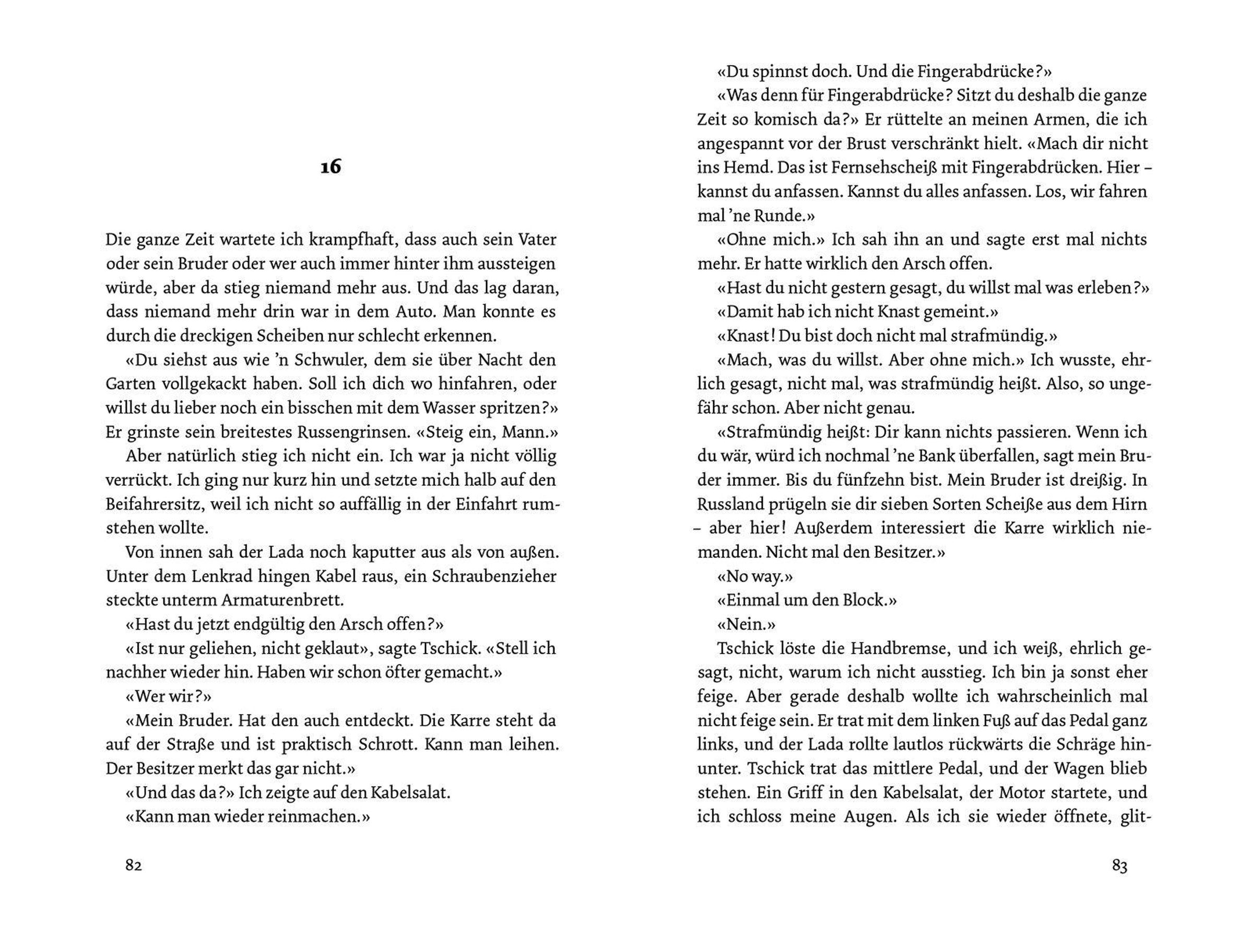 Mutter in der Entzugsklinik, Vater mit Assistentin auf Geschäftsreise: Maik Klingenberg wird die großen Ferien allein am Pool der elterlichen Villa verbringen. Doch dann kreuzt Tschick auf. Tschick, eigentlich Andrej Tschichatschow, kommt aus einem der Asi-Hochhäuser in Hellersdorf, hat es von der Förderschule irgendwie bis aufs Gymnasium geschafft und wirkt doch nicht gerade wie das Musterbeispiel der Integration. Außerdem hat er einen geklauten Wagen zur Hand. Und damit beginnt eine unvergessliche Reise ohne Karte und Kompass durch die sommerglühende deutsche Provinz.
