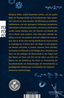 Wolfgang Rößler erzählt bestechend einfach, wie die großen Köpfe der Physikgeschichte auf ihre bedeutenden Ideen gekommen sind und wie diese aussehen. Die Mischung aus Anekdoten, Indiskretionen und sehr gelungenen Erklärungen komplizierter Sachverhalte ist fesselnd geschrieben, und nicht nur die Personen werden wieder lebendig, auch ihre Theorien und Modelle. Wer sich in Physik kaum auskennt, wird vieles ganz nebenbei verstehen, und wer sich auskennt, wird sich vielleicht ein wenig ärgern, dass er all das schon einmal abstrakt lernen musste anstatt so eingängig wie in diesem Buch. Der Bogen ist weit gespannt von Newton und Galilei zu Einstein, Feymann, Fermi und Bohr; von Faraday und Maxwell zu Schrödinger, Dirac, Heisenberg und pauli; von den Anfängen der Wissenschaft zu den Fragen nach dem Wesen von Raum und Zeit und der Natur von Licht und Wärme. Von der Entdeckung des Atoms zur Formulierung der Quantenmechanik; von Beobachtungen des Sternenhimmels zu grundlegenden Entdeckungen und Gedanken der modernen Astronomie und Kosmologie.