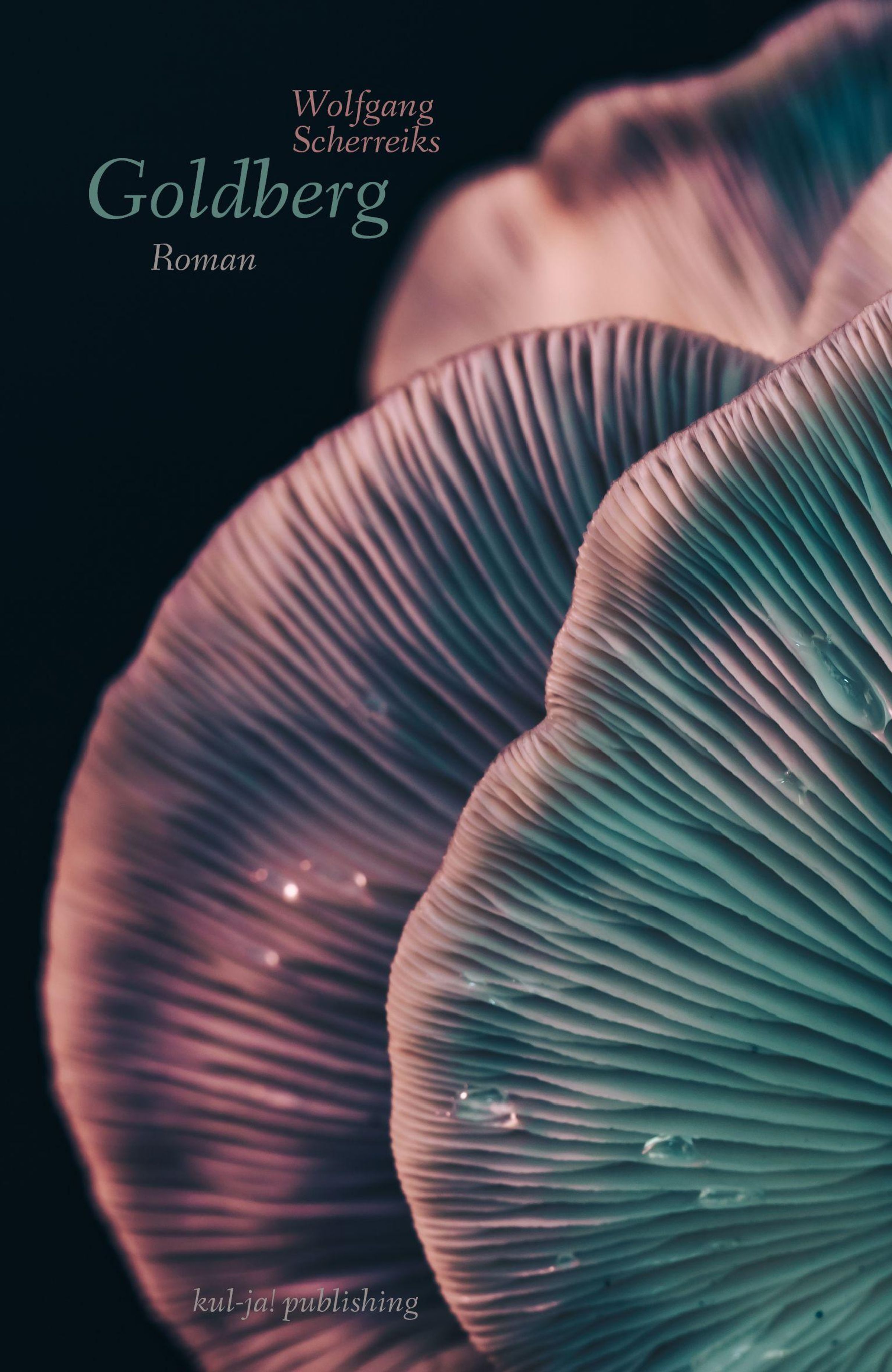 "Roman: Goldberg von Wolfgang Scherreiks. Großaufnahme von Pilzlamellen in rosa und blauen Farbtönen.", Buch