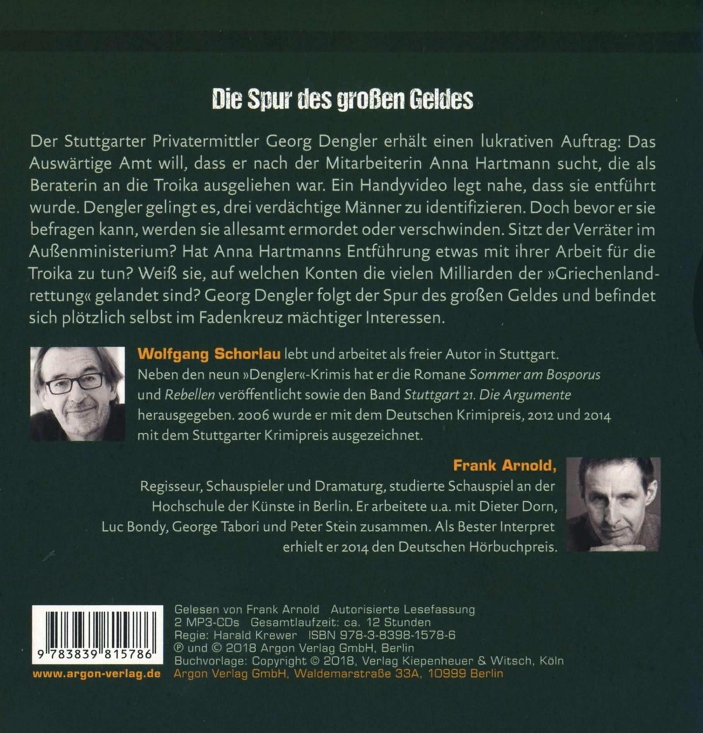 Der Stuttgarter Privatermittler Georg Dengler erhält einen lukrativen Auftrag: Das Auswärtige Amt will, dass er nach der Mitarbeiterin Anna Hartmann sucht, die als Beraterin an die Troika ausgeliehen war. Ein Handyvideo legt nahe, dass sie entführt wurde. Dengler gelingt es, drei verdächtige Männer zu identifizieren. Doch bevor er sie befragen kann, werden sie allesamt ermordet oder verschwinden. Sitzt der Verräter im Außenministerium? Hat Anna Hartmanns Entführung etwas mit ihrer Arbeit für die Troika zu tun? Weiß sie, auf welchen Konten die vielen Milliarden der >>Griechenlandrettung<< gelandet sind? Georg Dengler folgt der Spur des großen Geldes und befindet sich plötzlich selbst im Fadenkreuz mächtiger Interessen.