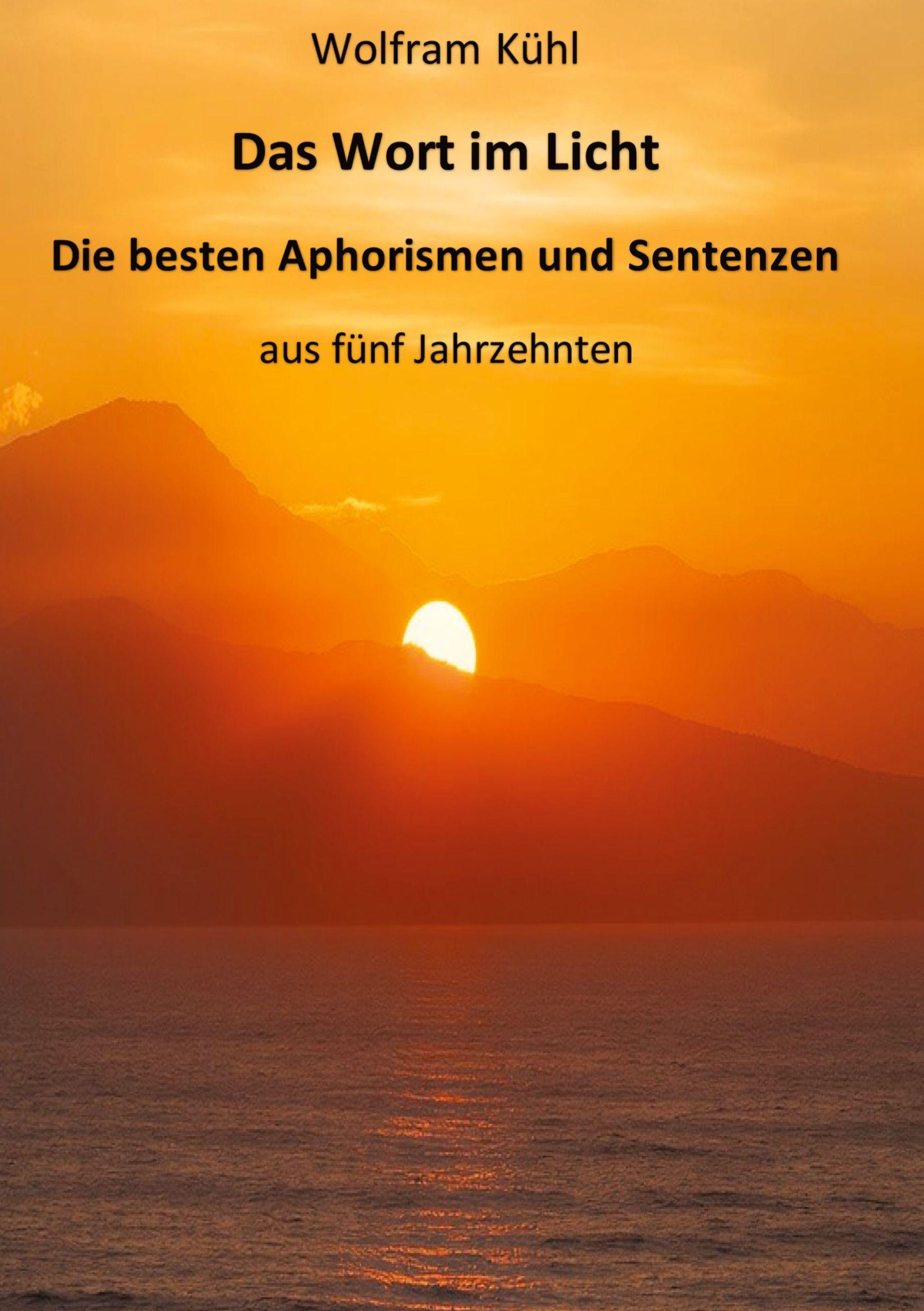 Text: "Wolfram Kühl, Das Wort im Licht, Die besten Aphorismen und Sentenzen, aus fünf Jahrzehnten." Hintergrund: Sonnenuntergang über Meer., Buch