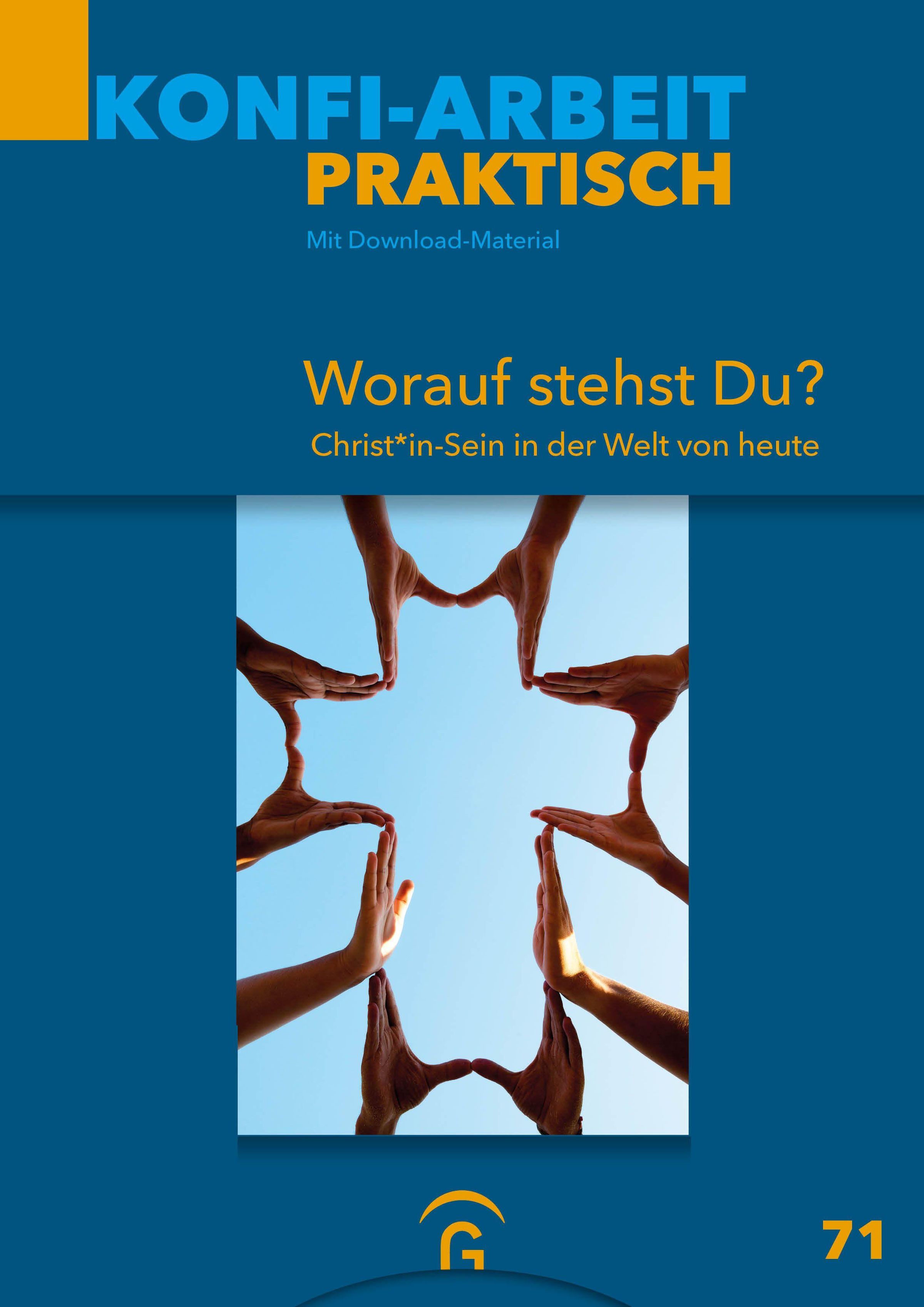 „Konfi-Arbeit praktisch“, „Worauf stehst Du? Christ*in-Sein in der Welt von heute“. Bild zeigt Hände im Kreis., Buch