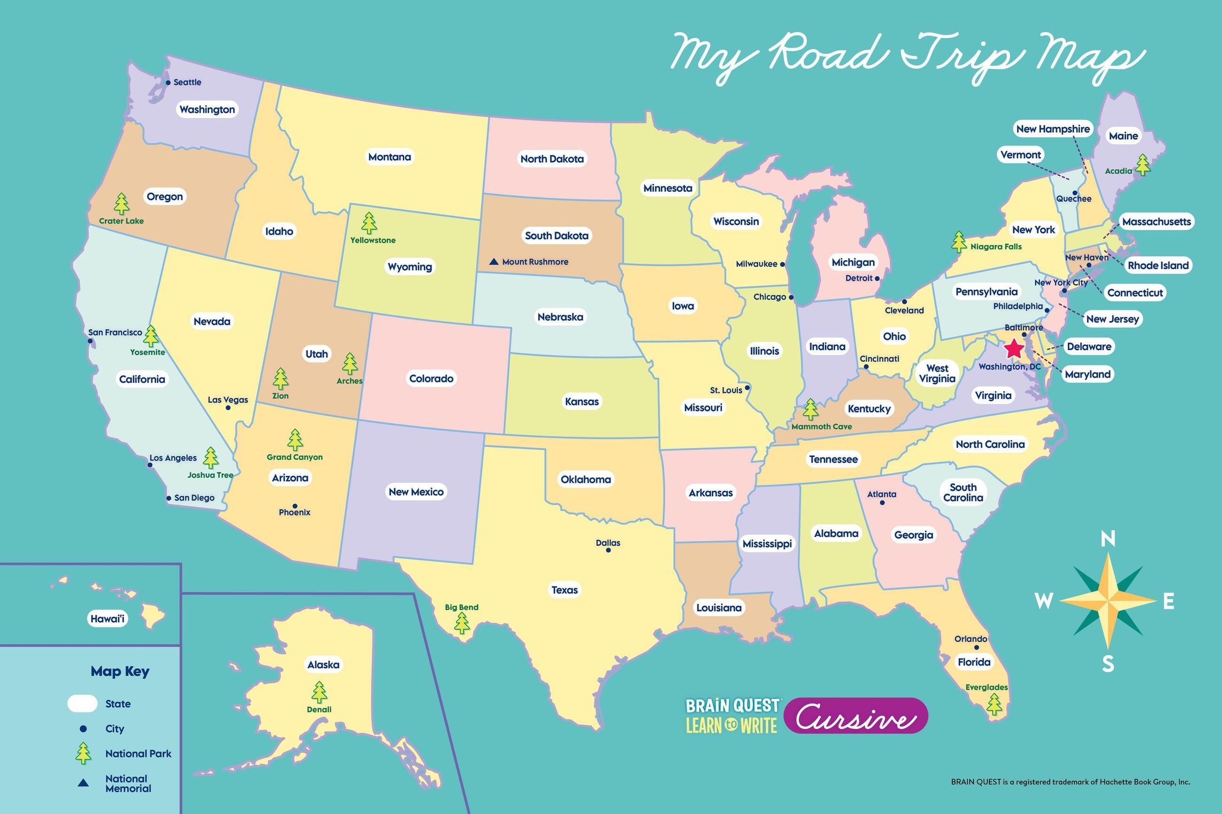 „BRAIN QUEST, LEARN to WRITE Cursive. Route 66. Comes with: Tons of handwriting practice!“ Zwei Kinder im Auto in der Wüste., Buch