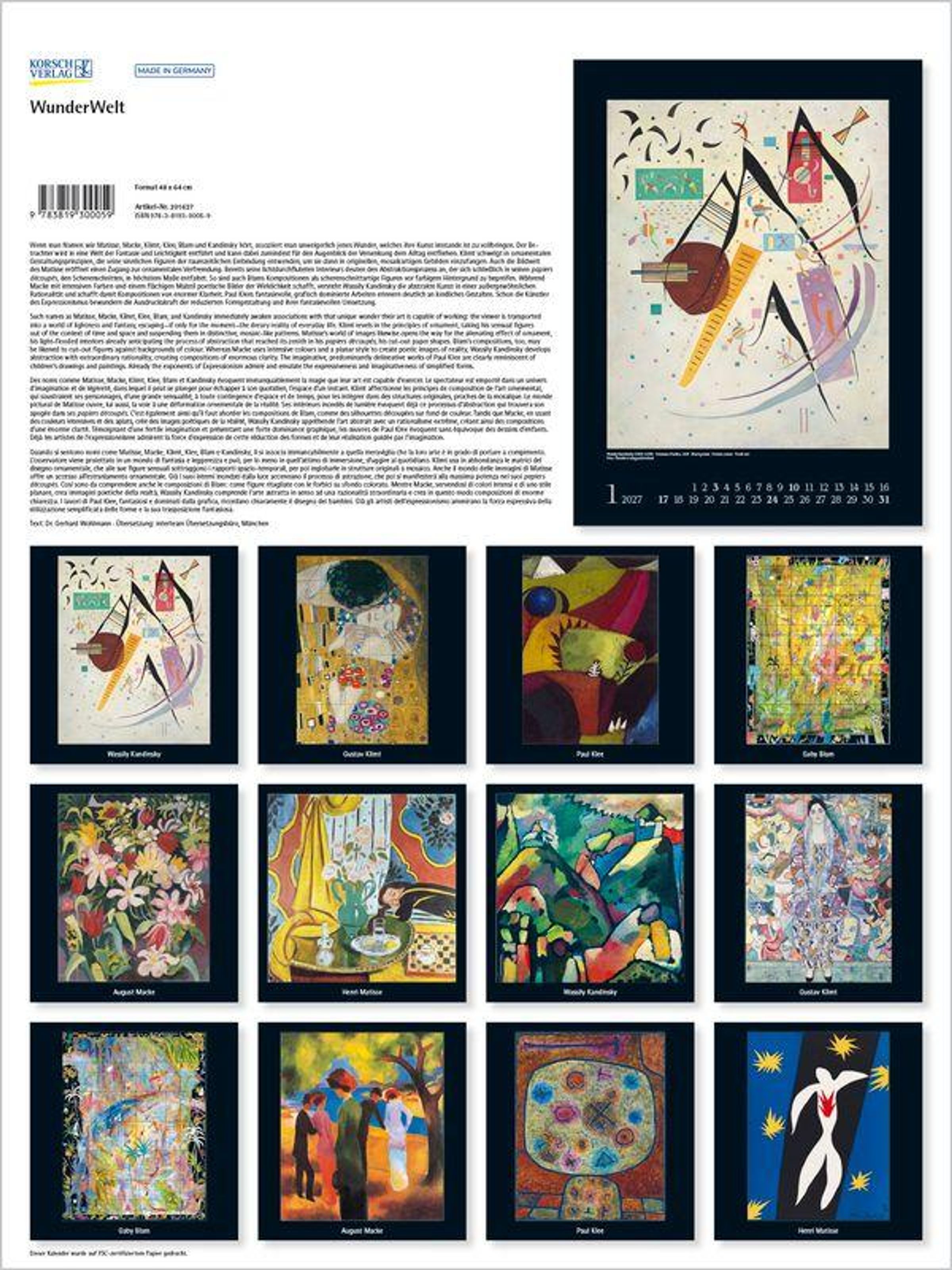 Dieser Kalender ist eine Einladung, der Augenlust zu frönen, die kleinen Dinge und die großen Gefühle zu genießen und die Heiterkeit des Herzens in der Wunderwelt der Kunst zu entdecken. Meisterhafte Werke von Kandinsky, Macke, Klimt, Matisse, Klee und Gaby Blam entführen den Betrachter in diesen einzigartigen Kosmos der Kunst.