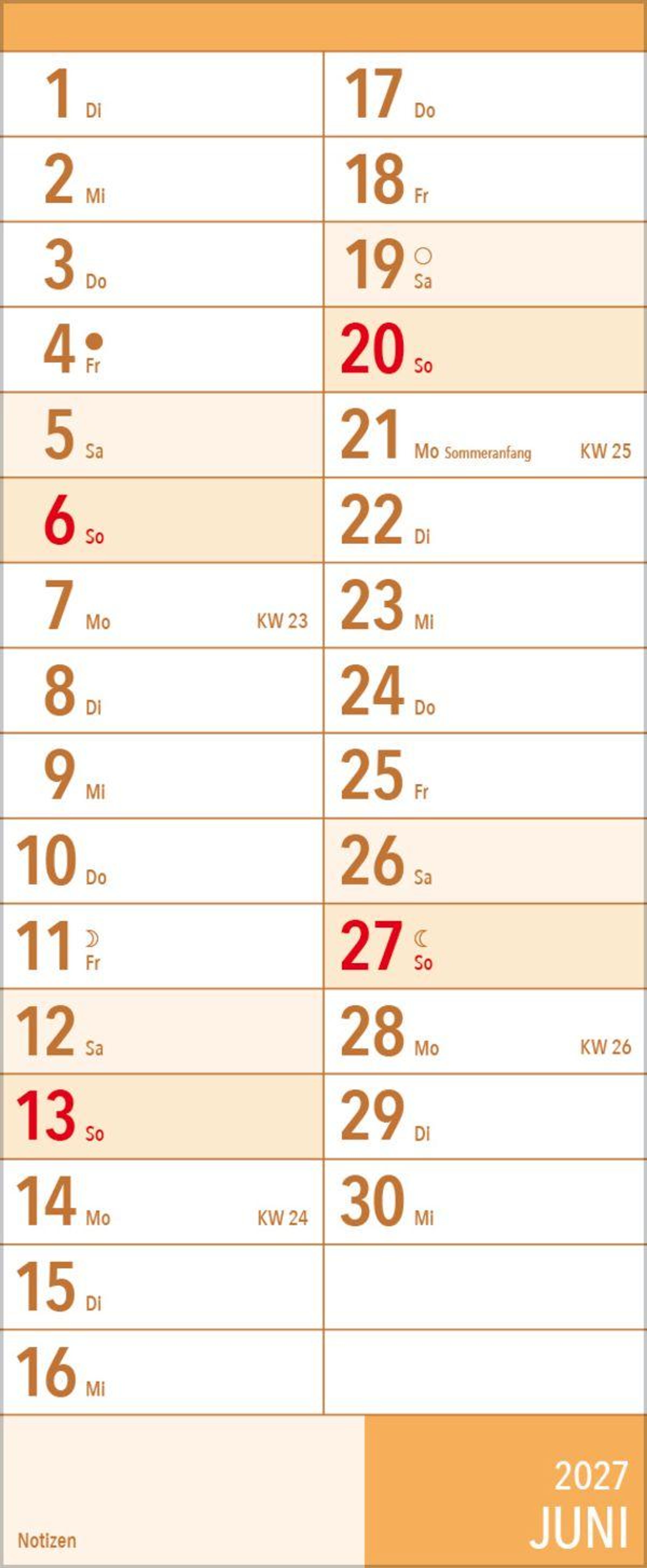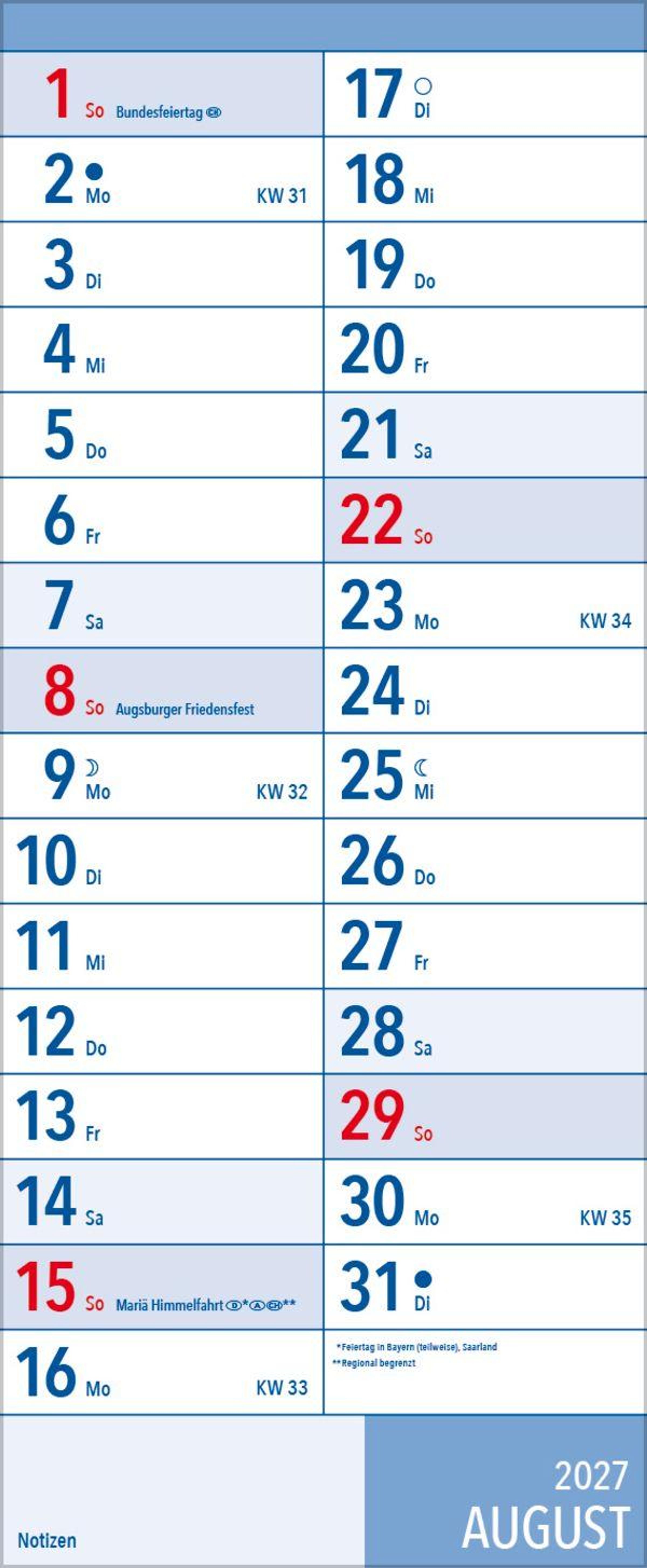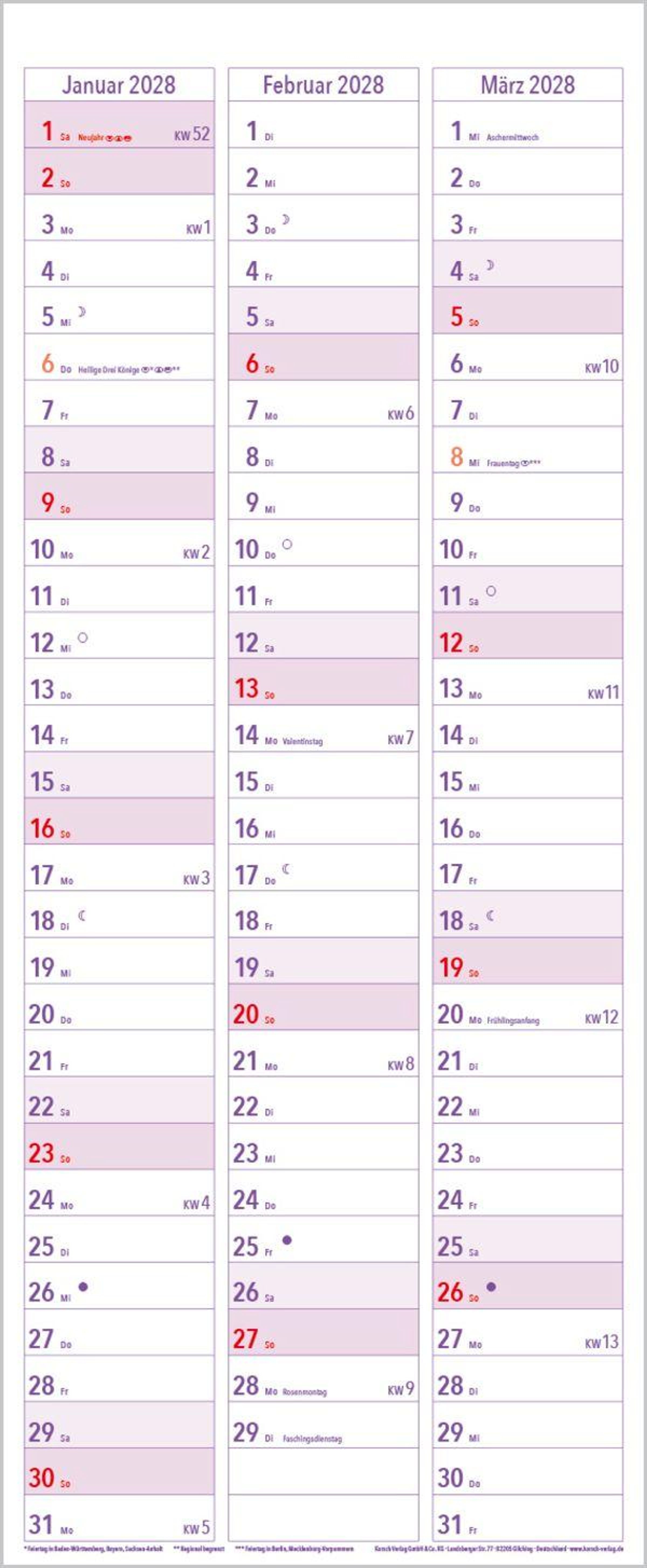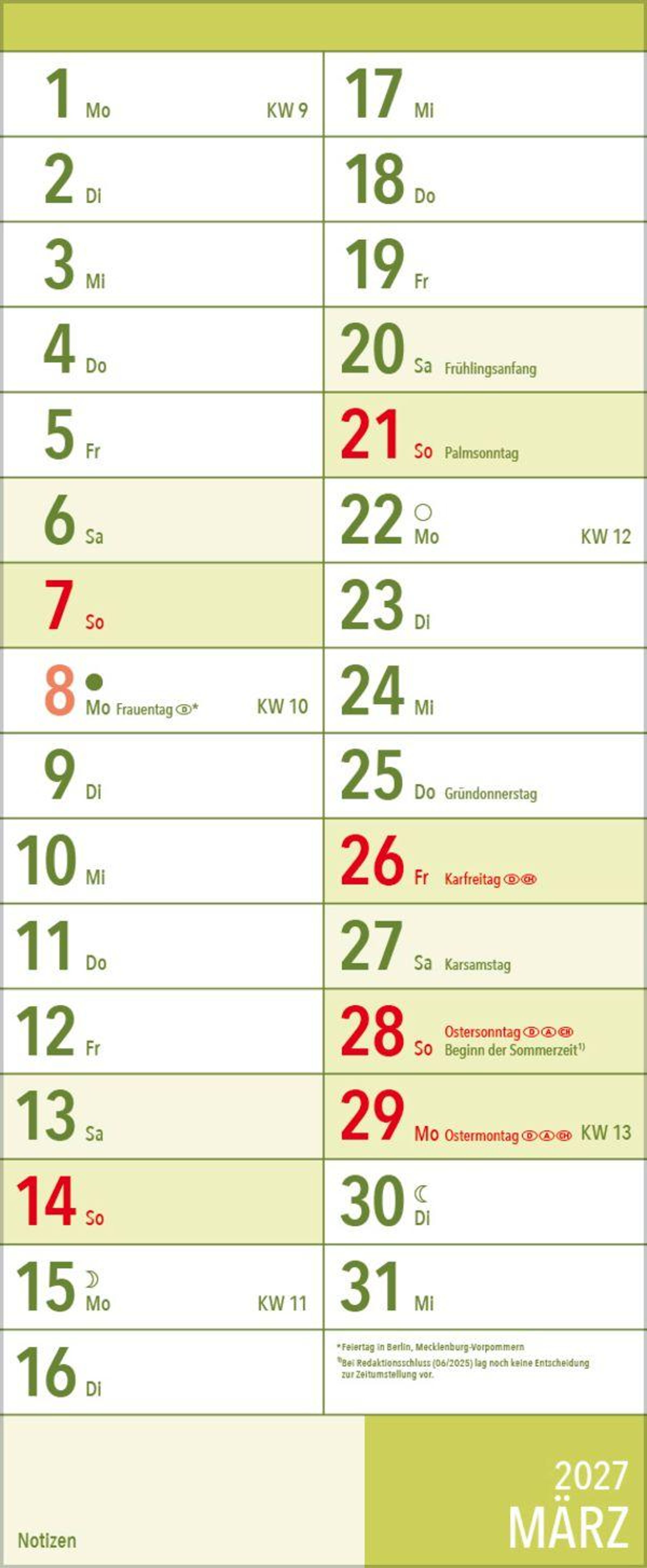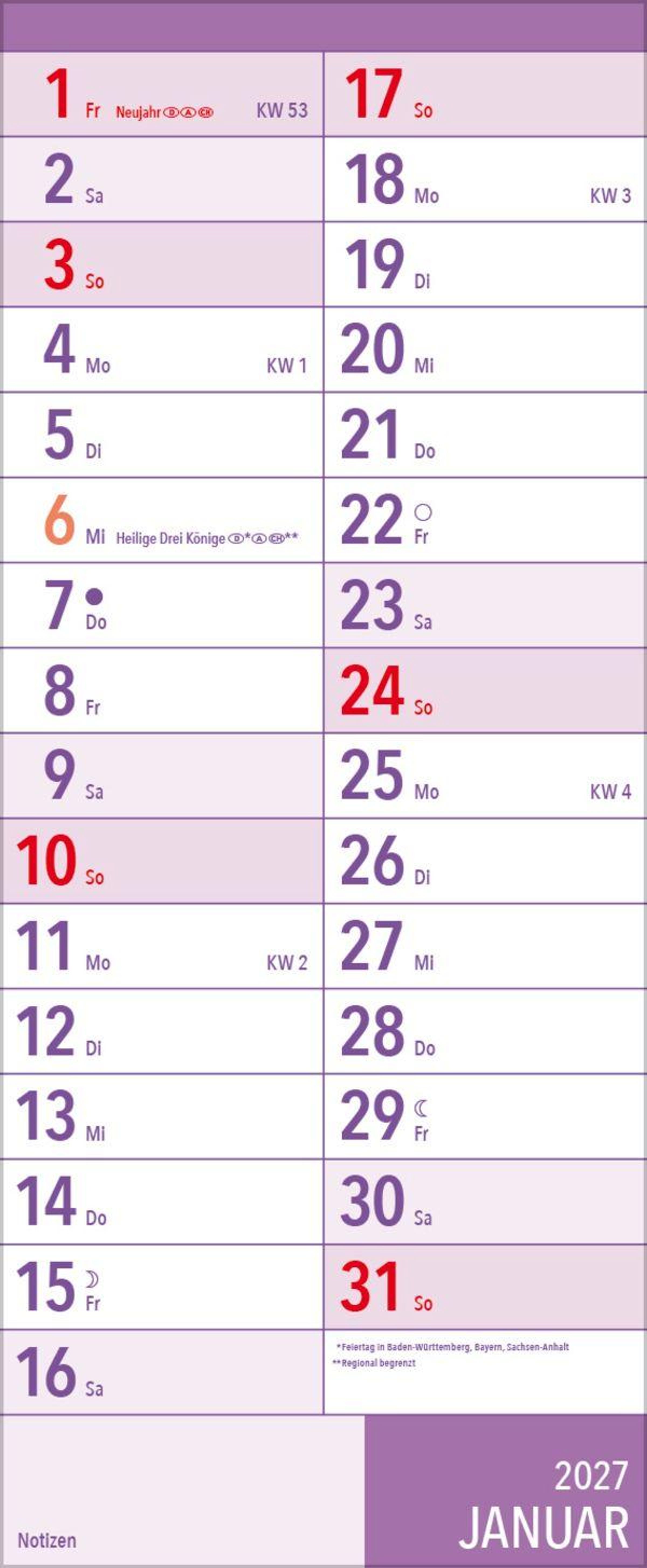Produktmerkmale Format: 19 x 46 cm; schmaler Wandkalender mit extra viel Platz für Termine Kalendarium mit großen Zahlen auf Deutsch mit hervorgehobenen Sonn- und Feiertagen für D, A und CH Gedruckt auf umweltfreundlichem FSC Papier XL-Wandkalender mit extra großer Schrift und modernen Farben. Inklusive Ferienterminen und Vorschau bis März des Folgejahres. Kalendarium in Deutsch.