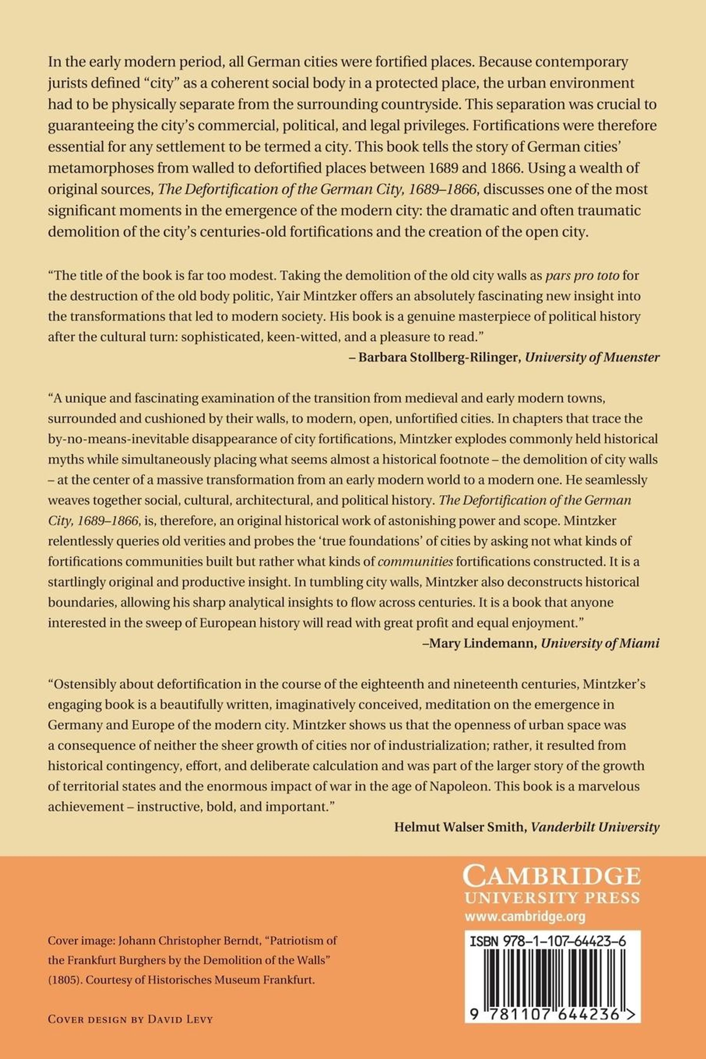 In the early modern period, all German cities were fortified places. Because contemporary jurists have defined 'city' as a coherent social body in a protected place, the urban environment had to be physically separate from the surrounding countryside. This separation was crucial to guaranteeing the city's commercial, political and legal privileges. Fortifications were therefore essential for any settlement to be termed a city. This book tells the story of German cities' metamorphoses from walled to de-fortified places between 1689 and 1866. Using a wealth of original sources, The Defortification of the German City, 1689-1866 discusses one of the most significant moments in the emergence of the modern city: the dramatic and often traumatic demolition of the city's centuries-old fortifications and the creation of the open city.