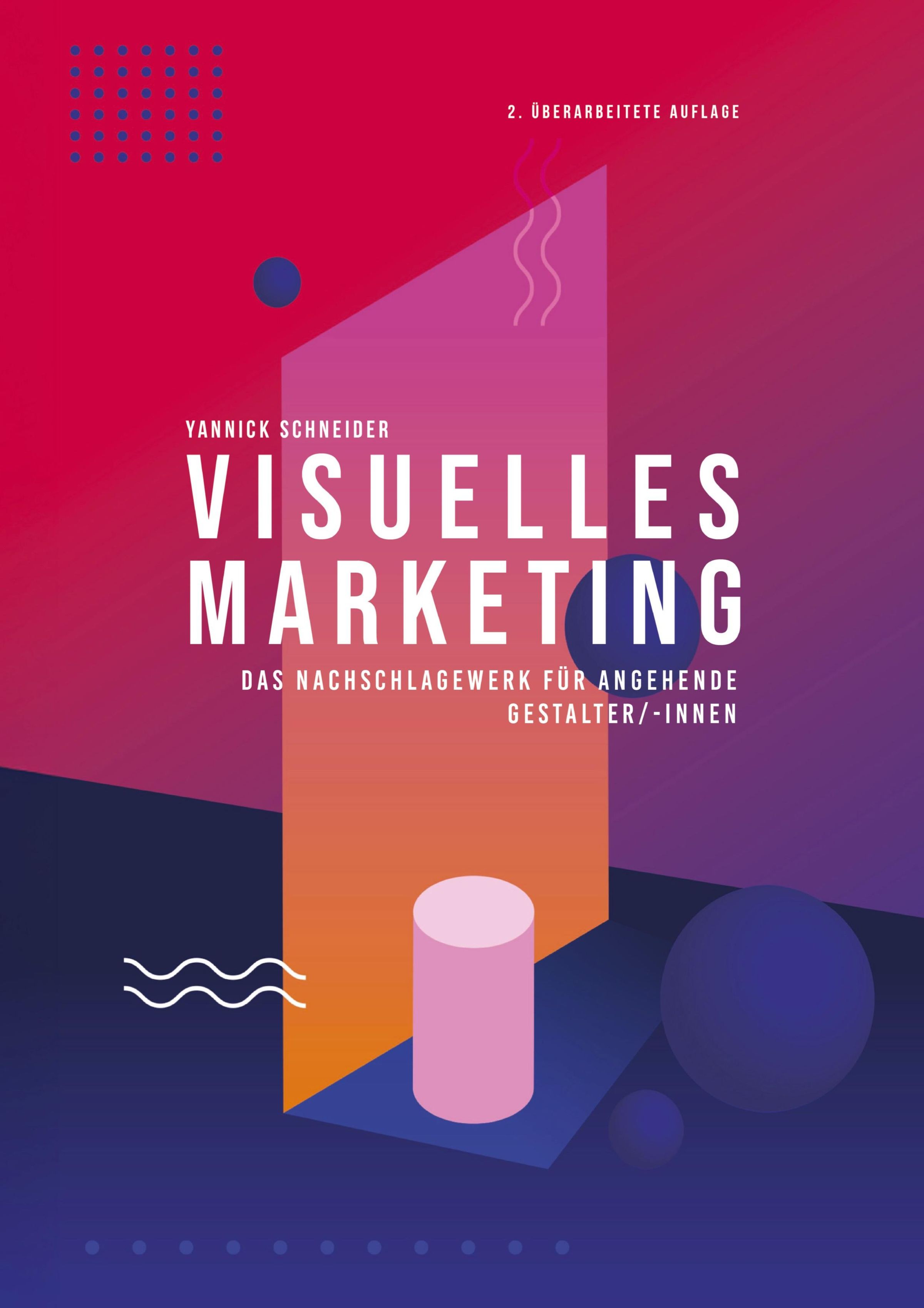 „2. Überarbeitete Auflage“, „Yannick Schneider“, „Visuelles Marketing“, geometrische Formen und leuchtende Farbverläufe., Buch