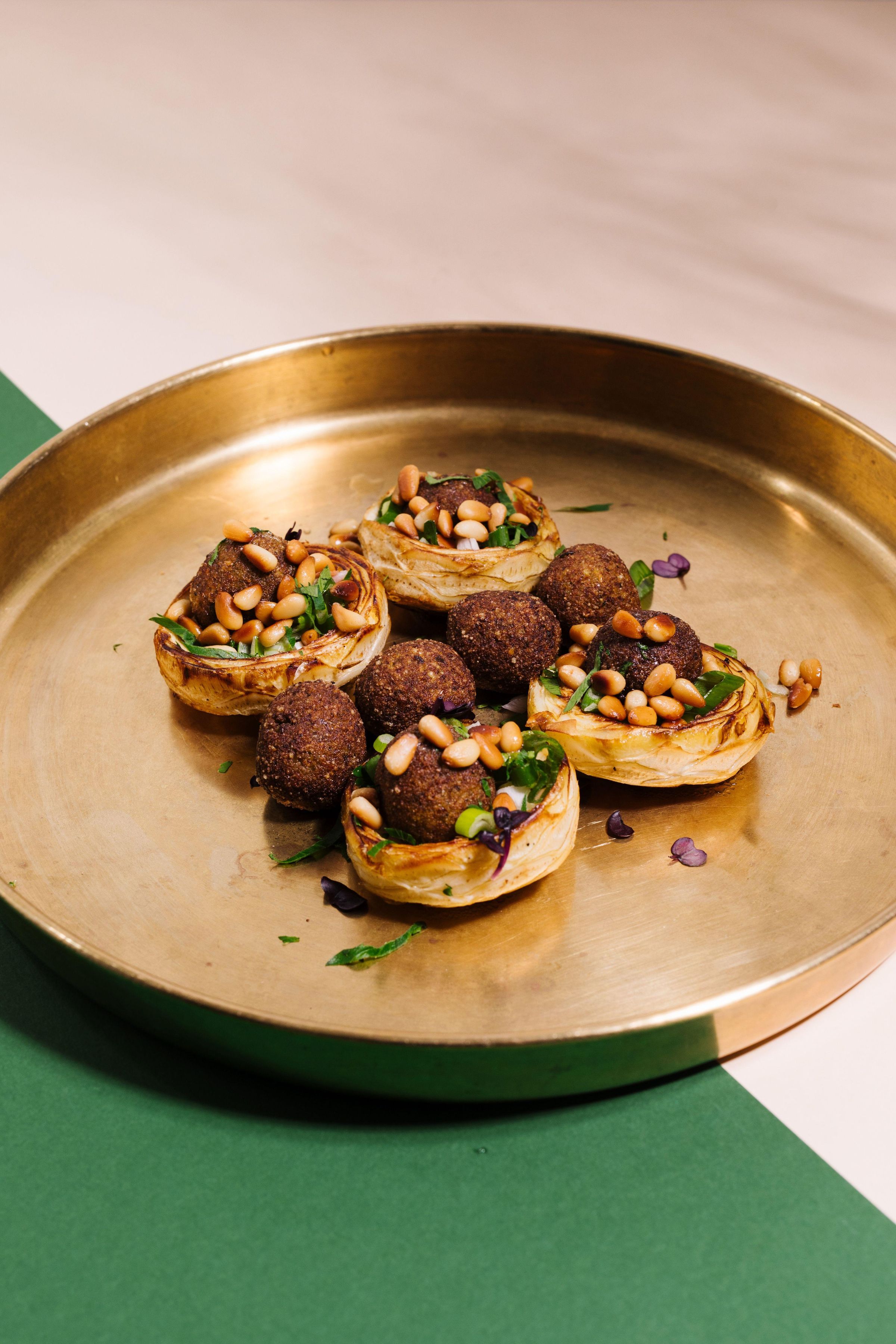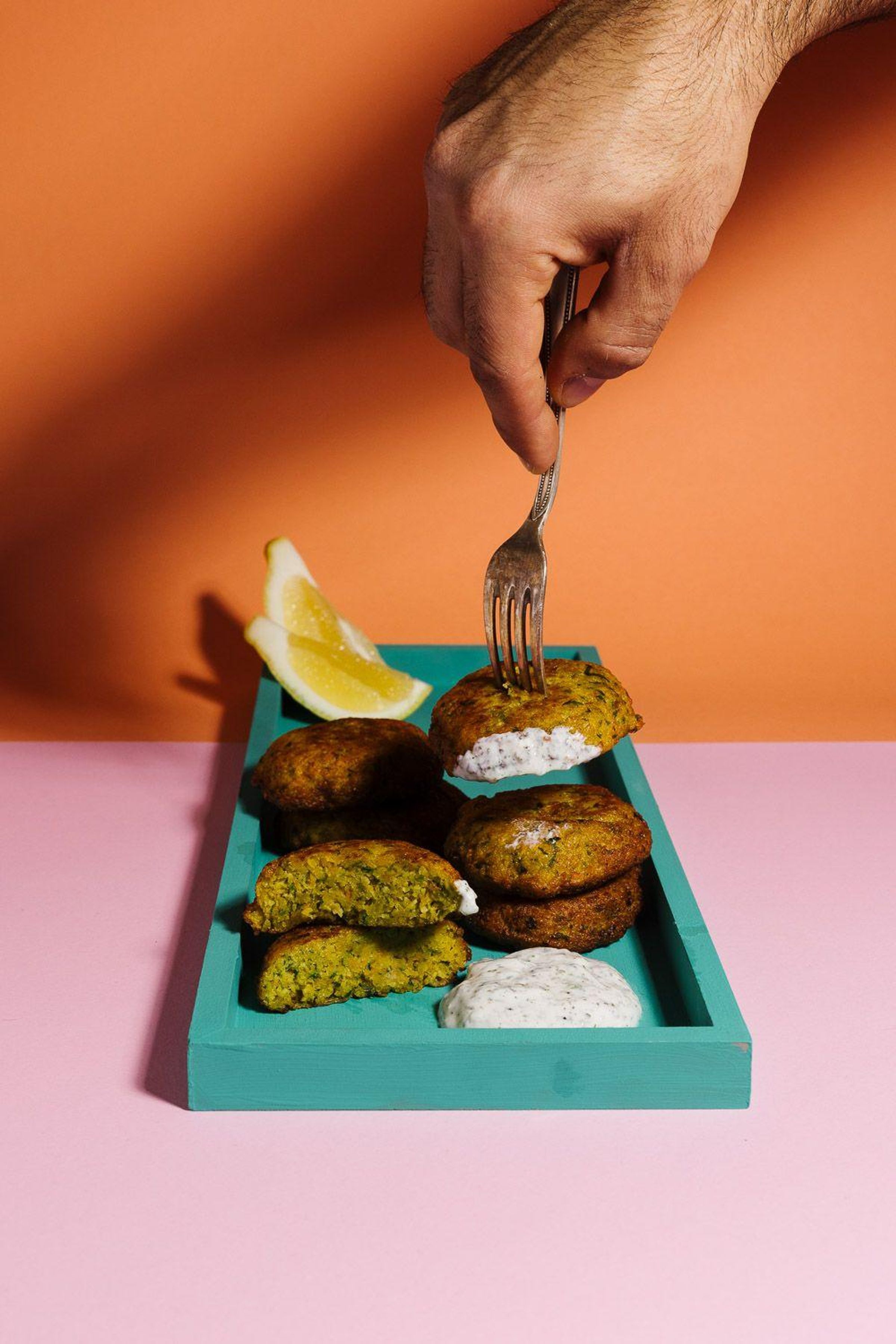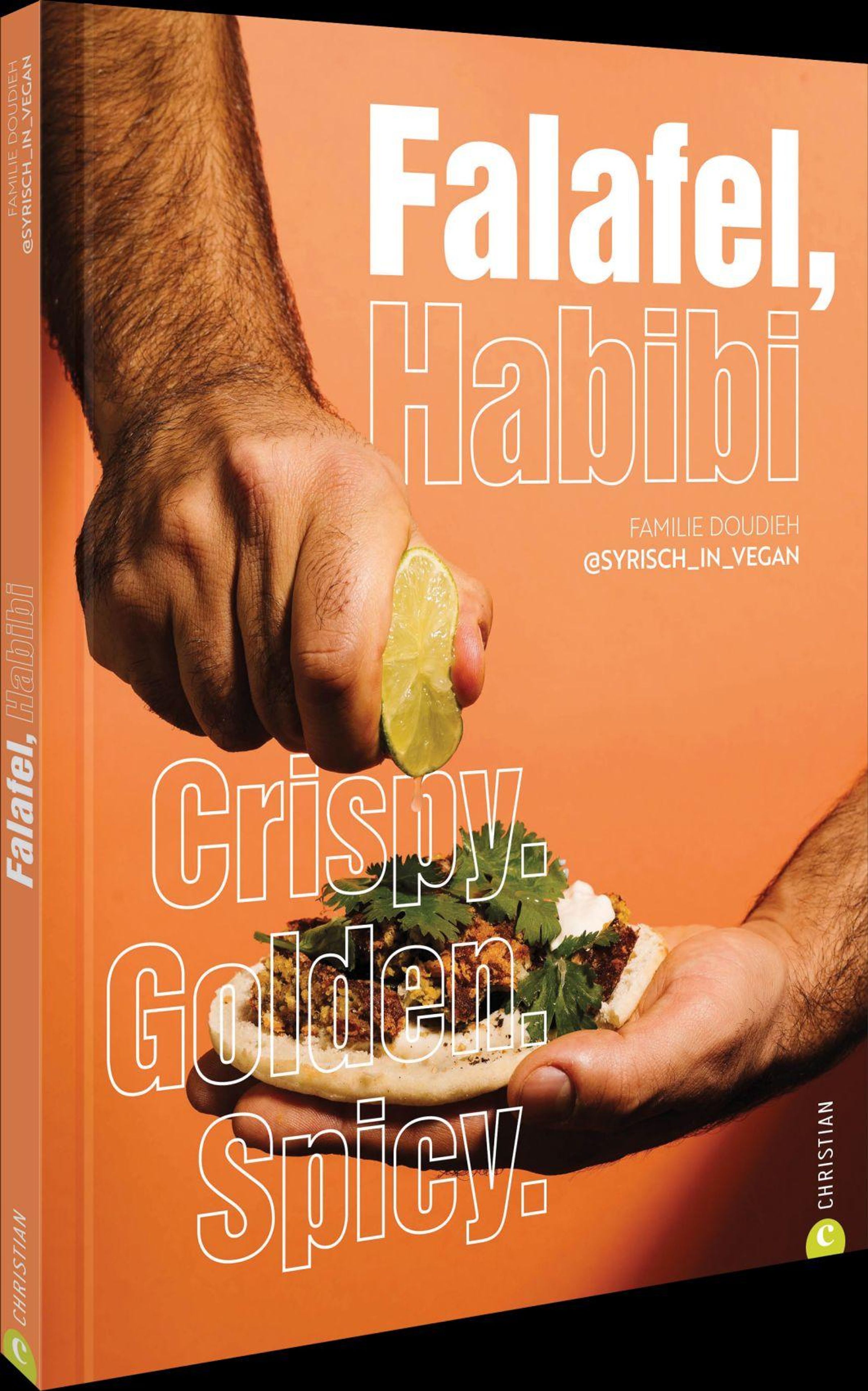 "Falafel, Habibi. Familie Doudieh @syrisch_in_vegan. Crispy. Golden. Spicy." Zwei Hände, eine presst eine Limette über Falafel., Buch