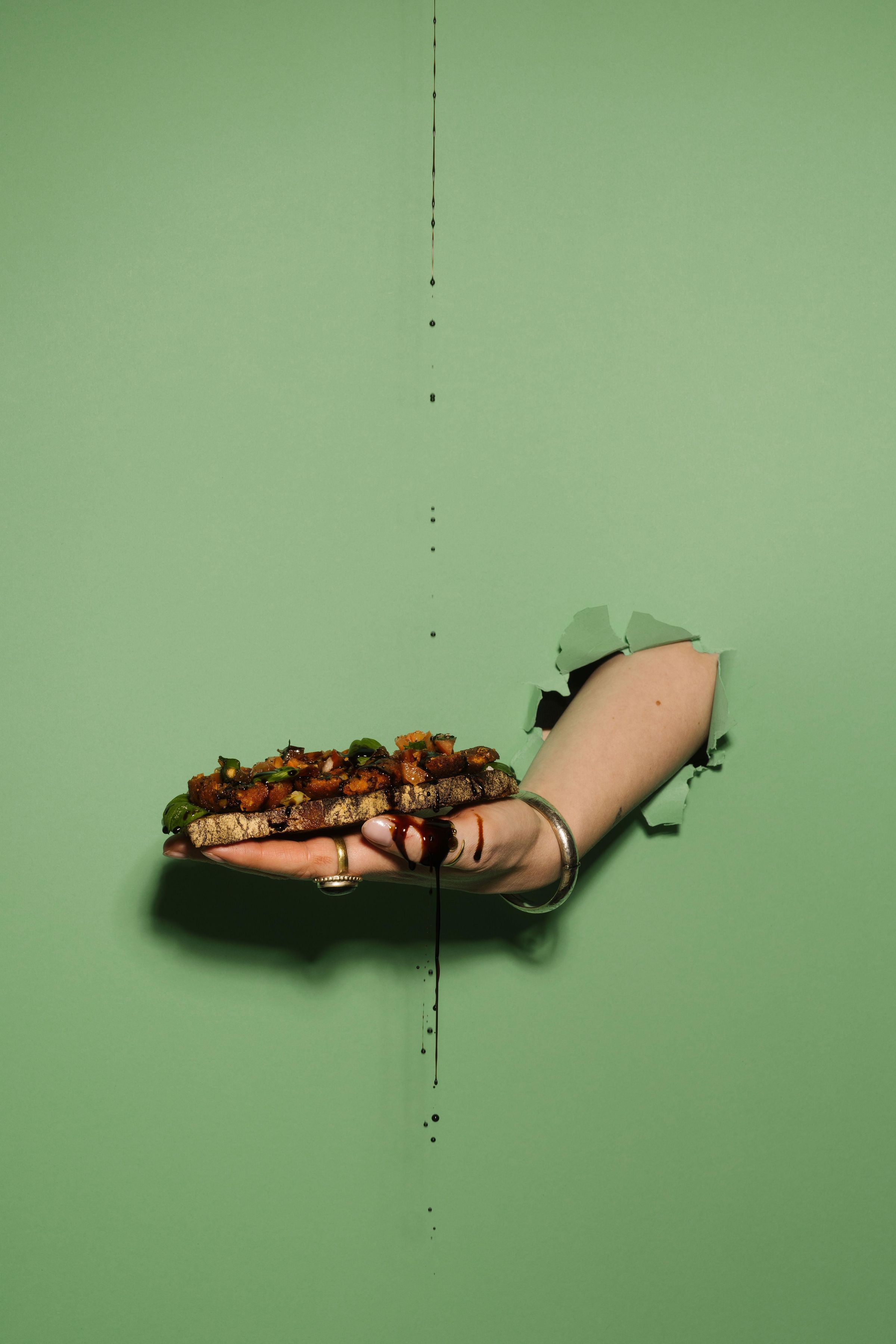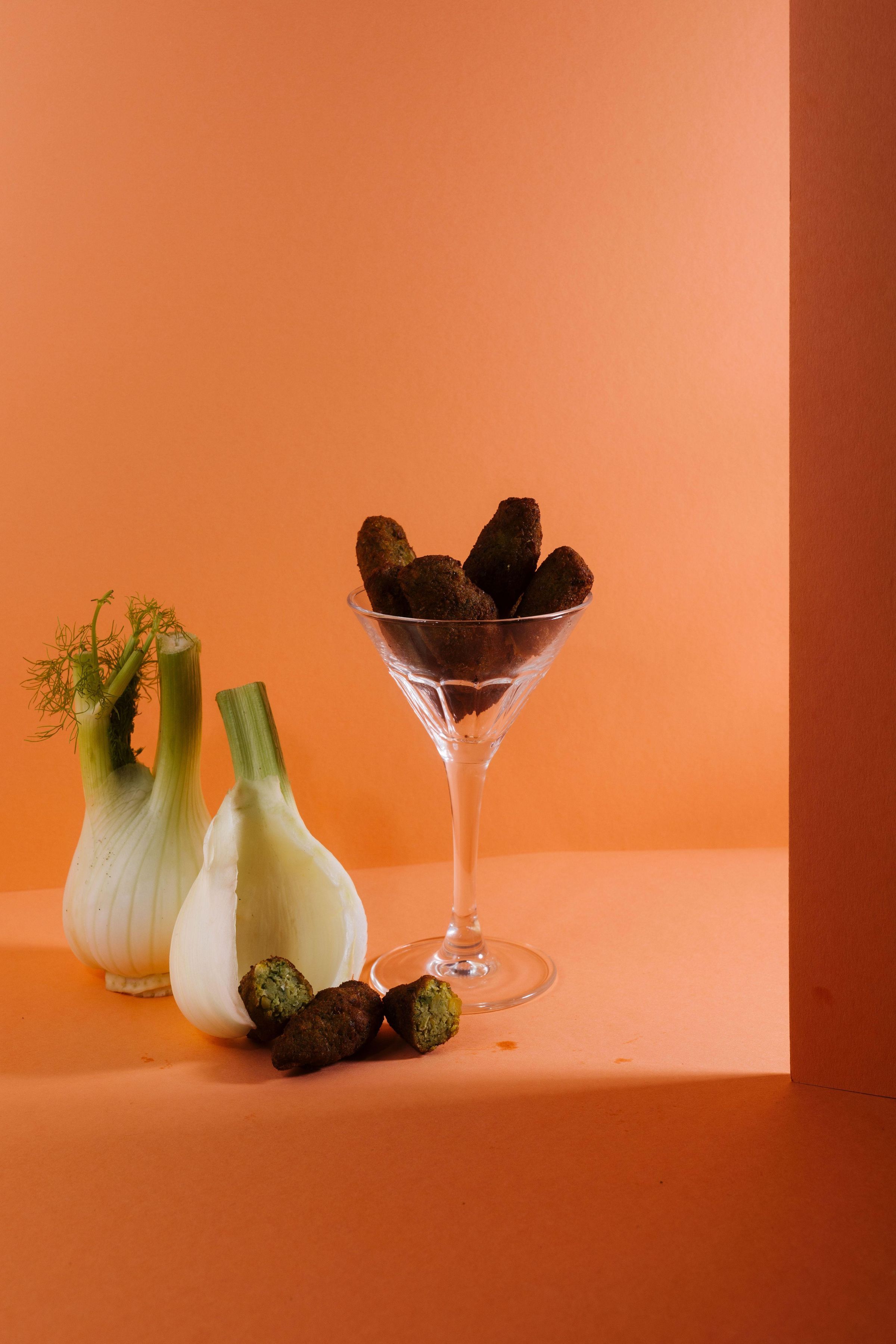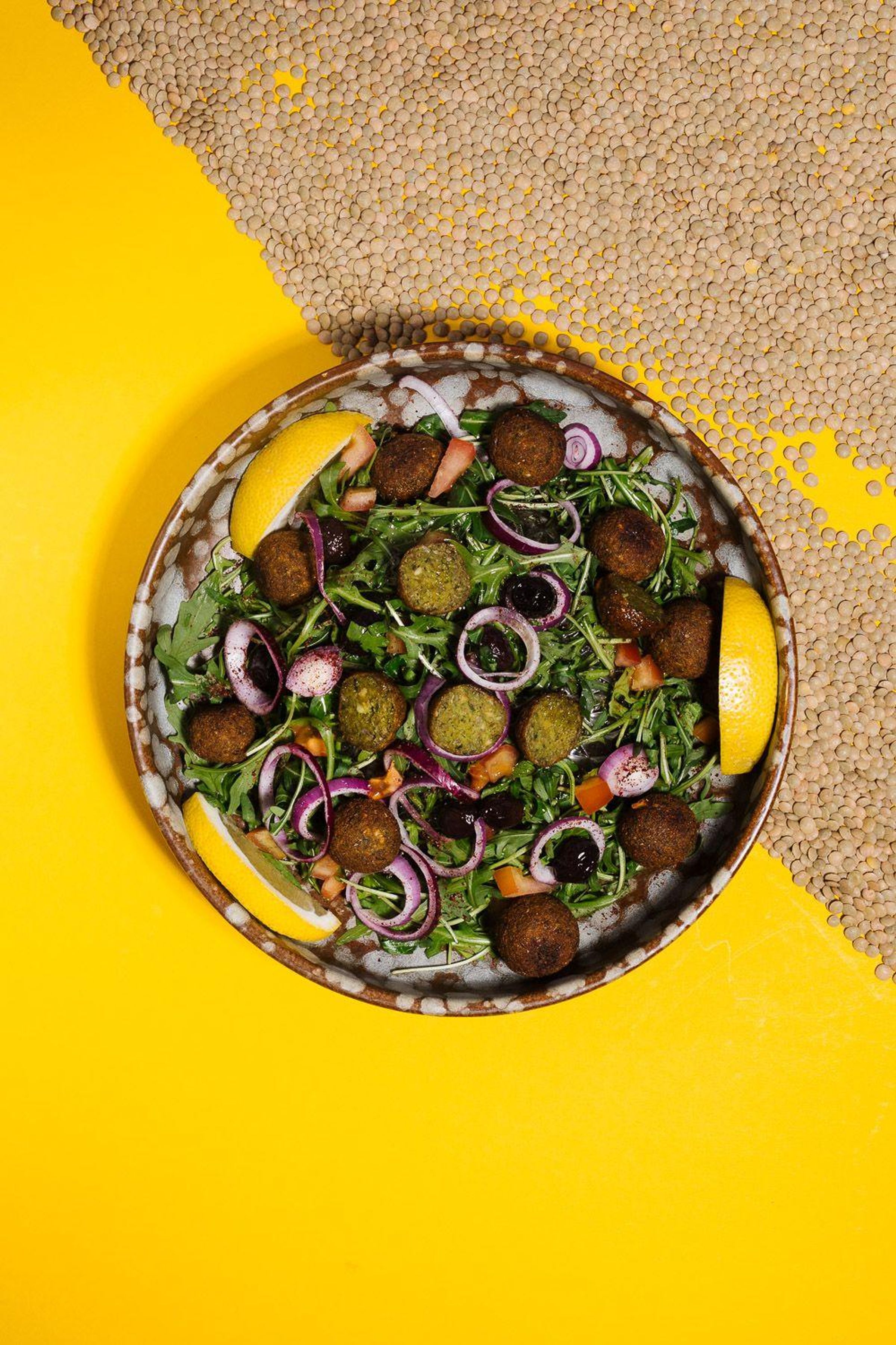 "Falafel, Habibi. Familie Doudieh @syrisch_in_vegan. Crispy. Golden. Spicy." Zwei Hände, eine presst eine Limette über Falafel., Buch