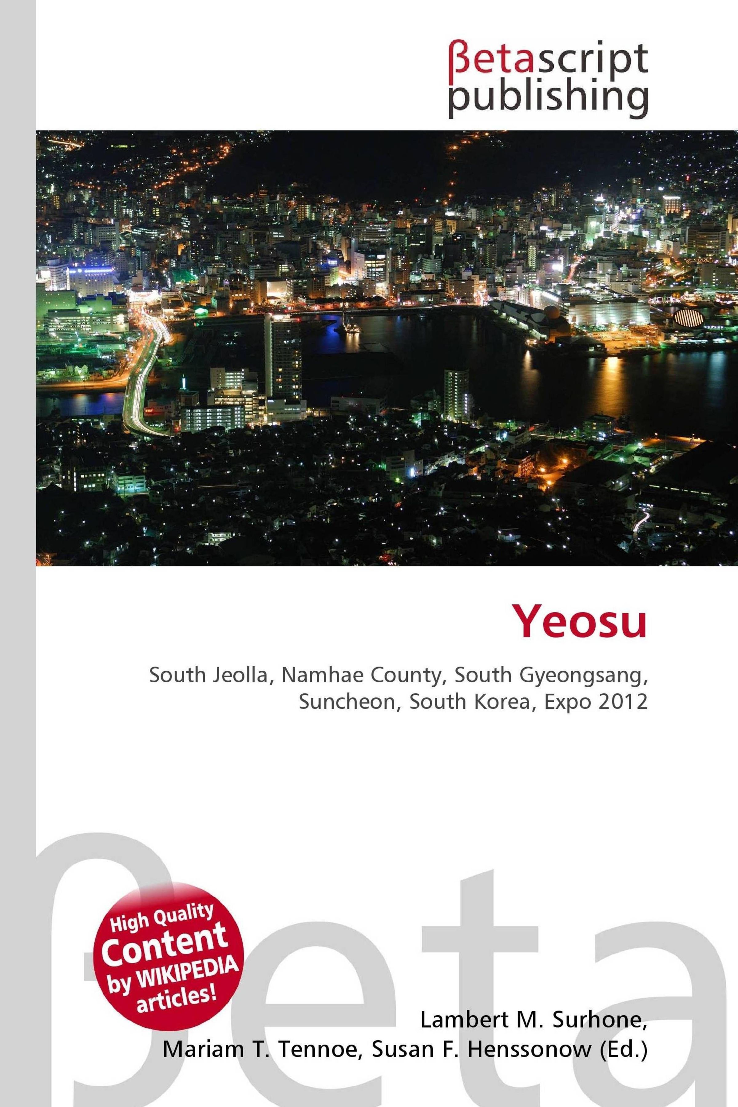 Please note that the content of this book primarily consists of articles available from Wikipedia or other free sources online. Yeosu (Yeosu-si) is a city in South Jeolla Province, South Korea. Old Yeosu City, which was founded in 1949, Yeocheon City, founded in 1986, and Yeocheon County were merged into a new city in 1998. The city of Yeosu consists of the Yeosu peninsula as well as 317 islands (49 inhabited, 268 uninhabited). Lying about midway along the southern coast of South Korea, it is separated from Namhae County in South Gyeongsang Province to the east by a natural waterway, and the Bay of Suncheon to the west and northwest, the city of Suncheon sprawling along its banks. The city has three different City Halls. On April 1, 1998, the cities of Yeosu and Yeocheon, along with Yeocheon County merged to form the unified city of Yeosu. Thanks to the sea wind and warm current, Yeosu has cool summers and mild winters. Its ocean climate also brings Yeosu relatively longer springs and autumns than other regions. Yeosu is a city of history and loyalty where the headquarters of South Jeolla Province Navy Base was located, and the Great Admiral Yi Sun Shin invented the Geobukseon (turtle ship) to save the country while serving as the Navy Commander.