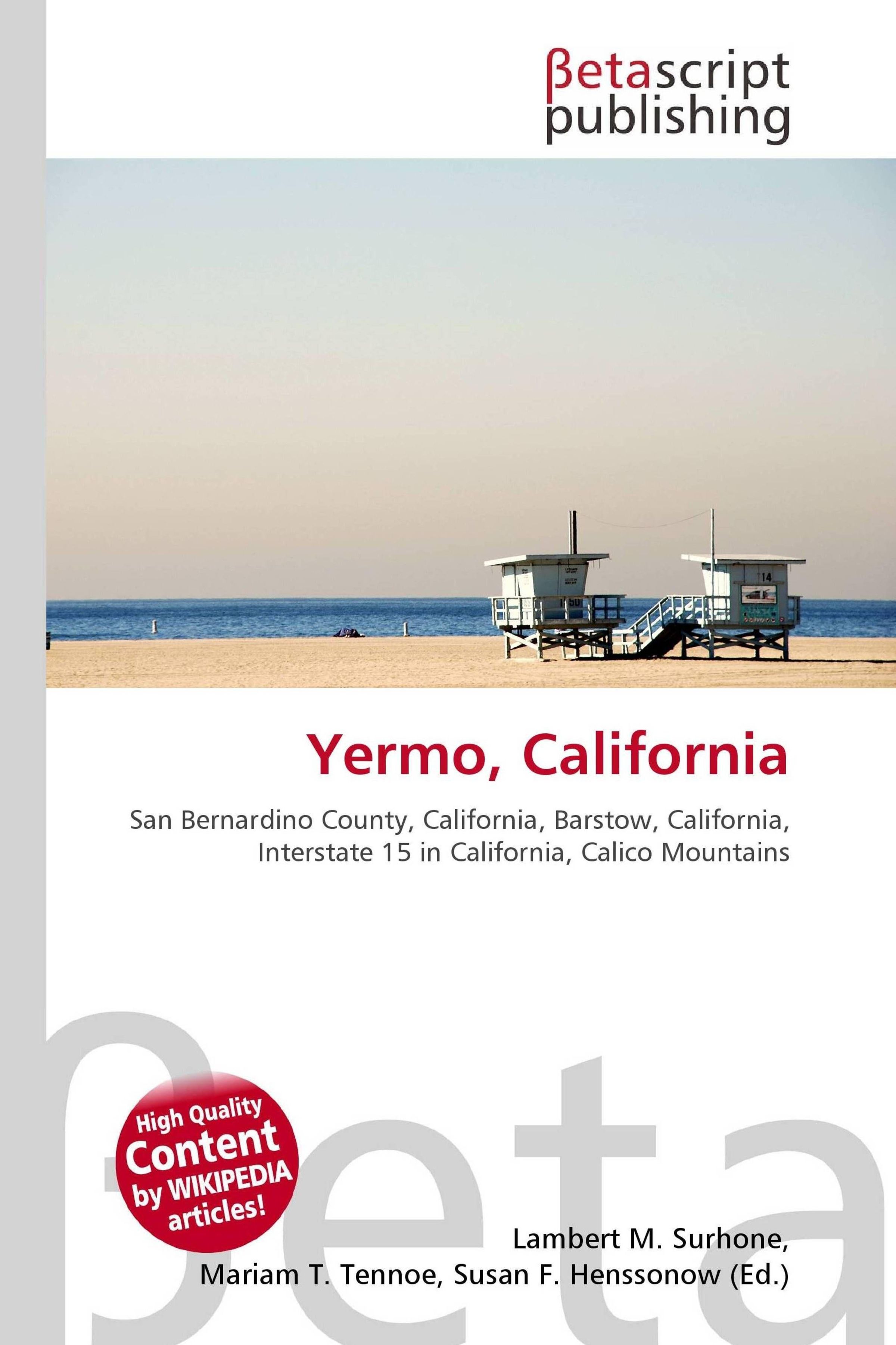 Please note that the content of this book primarily consists of articles available from Wikipedia or other free sources online. Yermo is a town in San Bernardino County, California. Its name is derived from the Spanish word for desert. It is located 13 miles east of Barstow in the Mojave Desert on Interstate 15, just south of the Calico Mountains. The town has a population of 1, 500-2, 000 (2009). The town is governed by an elected 5 member Board of Directors comprising the Community Services District authorized by the County of San Bernardino. The board meets once monthly. The CSD retains the following powers: Volunteer fire department, (Yermo / Calico V. F.D.), street lighting, parks and water maintenance. The ZIP Code is 92398, and the community is inside area code 760. Yermo has a "P. O. Box Only" U. S.P. S. delivery office. There is no street address delivery offered. Yermo hosts the 1859 acre (7.5 km2) storage and industrial annex of the Marine Corps Logistics Base Barstow.