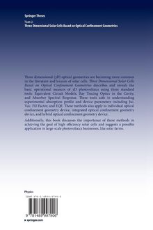 Three dimensional (3D) optical geometries are becoming more common in the literature and lexicon of solar cells. Three Dimensional Solar Cells Based on Optical Confinement Geometries describes and reveals the basic operational nuances of 3D photovoltaics using three standard tools: Equivalent Circuit Models, Ray Tracing Optics in the Cavity, and Absorber Spectral Response. These tools aide in understanding experimental absorption profile and device parameters including Jsc, Voc, Fill Factor, and EQE. These methods also apply to individual optical confinement geometry device, integrated optical confinement geometry device, and hybrid optical confinement geometry device.