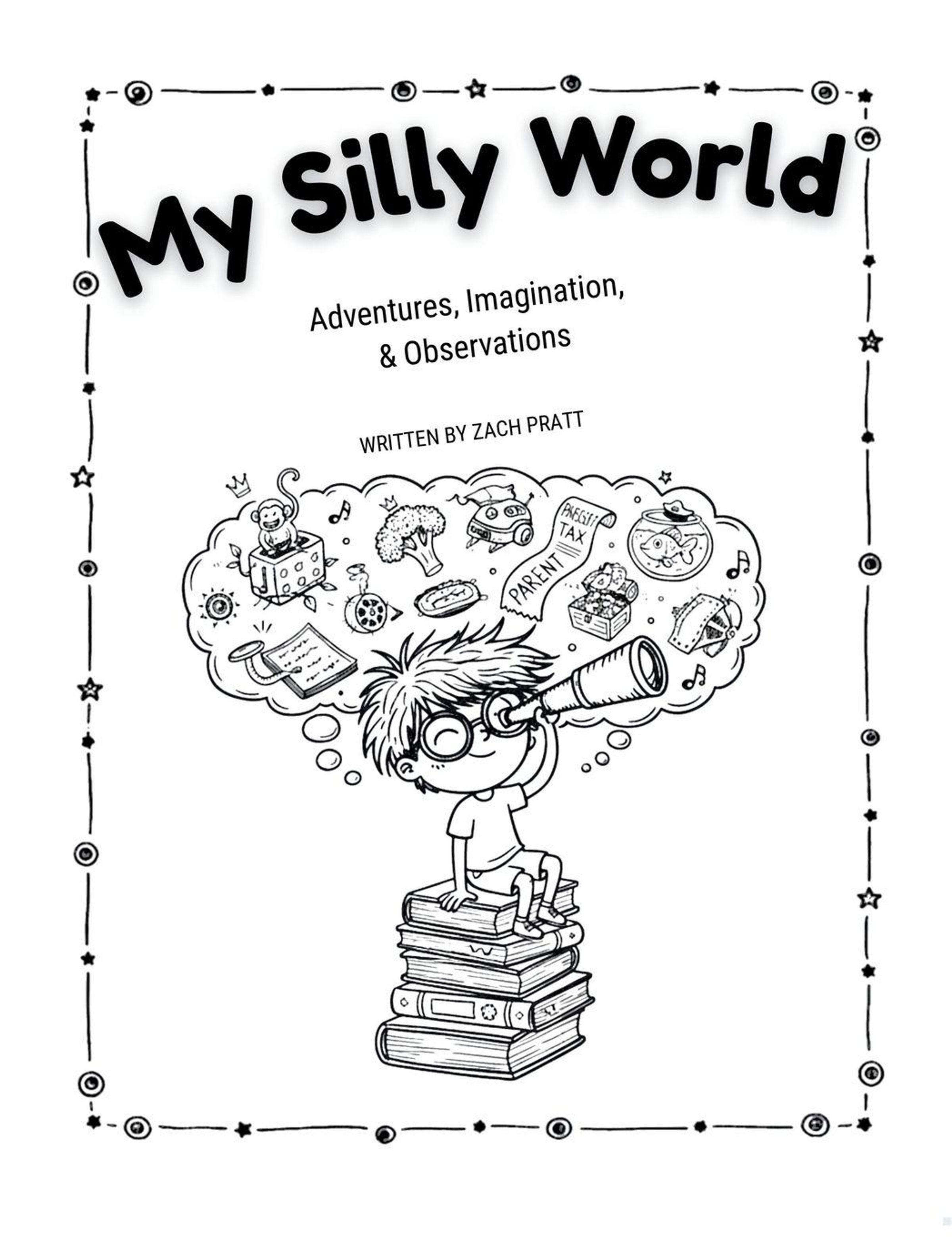 "My Silly World", "Adventures, Imagination, & Observations", "Written by Zach Pratt". Kind auf Bücherstapel träumt., Buch