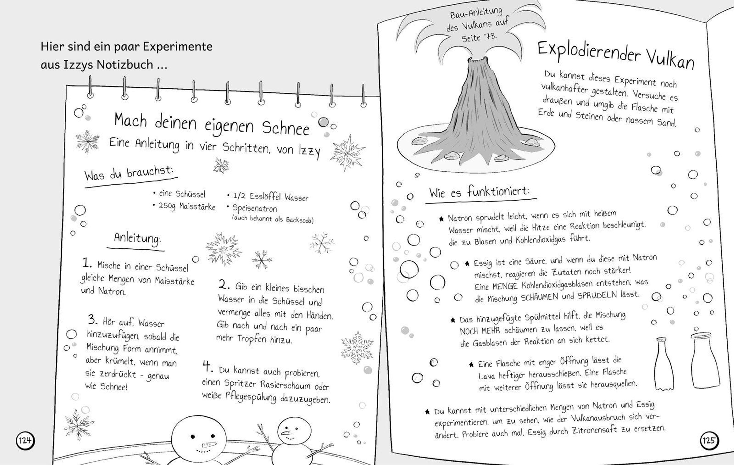 Titel: "IZZY - IRRE GENIAL: Der Märchen-Fluch". Zwei Kinder, eines mit Schutzbrille, neben einem roten Drachen und einem Vulkanexperiment., Buch