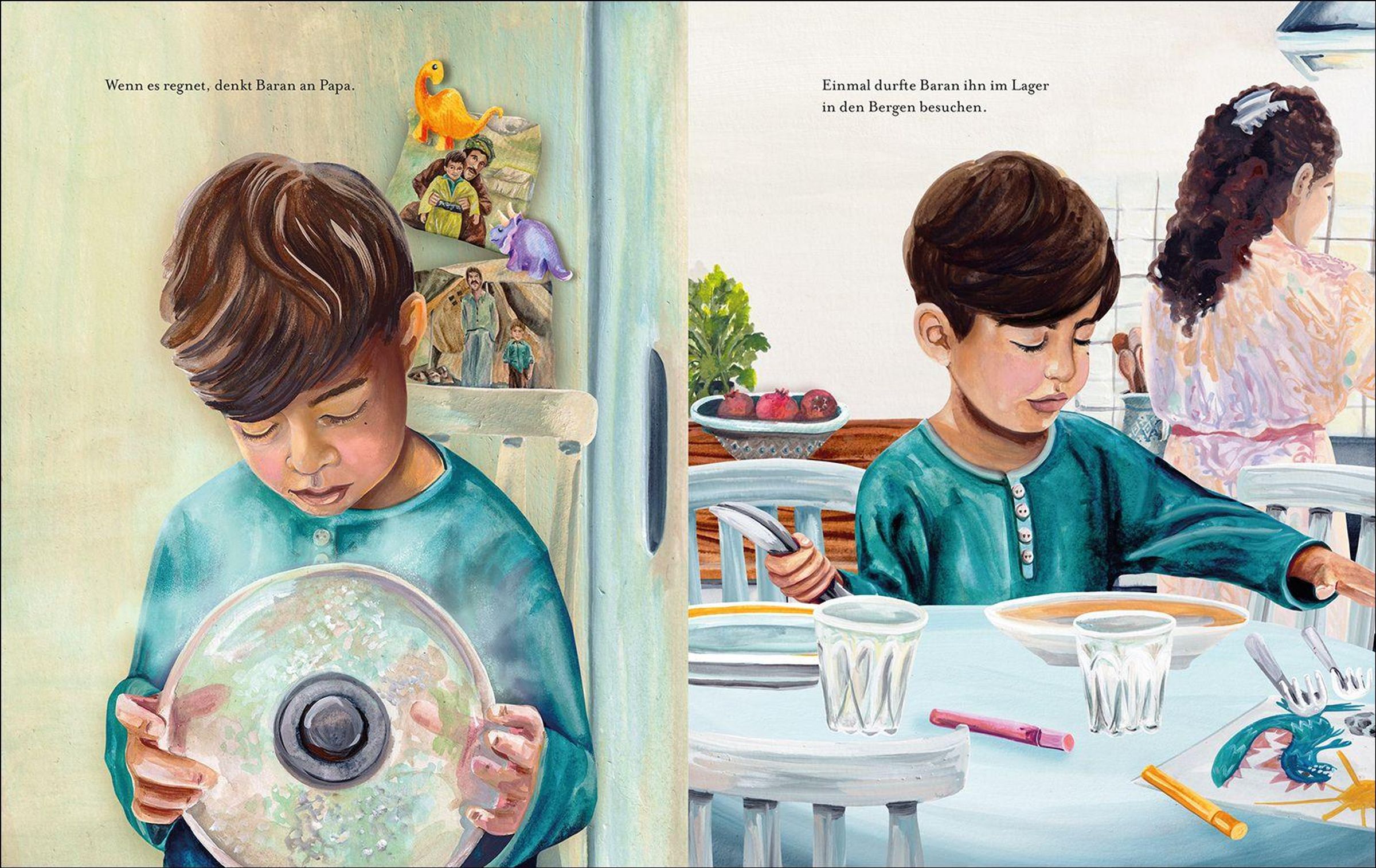 Immer wenn es regnet, denkt Baran an seinen Vater. Als er mit seiner Mutter flüchten musste, blieb der Papa zurück. Er musste die Brände löschen, vor denen sich die Menschen so fürchteten. Schließlich ist er ein Regenzauberer. Jetzt leben Baran und seine Mutter in einem fernen Land. Langsam gewöhnt er sich an die neue Sprache, an das riesige Wohnhaus, das fast bis in die Wolken reicht. Doch seinen Papa vermisst er jeden Tag. Wie schön wäre es, wenn der ihn einmal von der Vorschule abholen könnte? Bis eines Tages endlich der Moment kommt, an dem Baran seinen Vater in die Arme schließen kann.