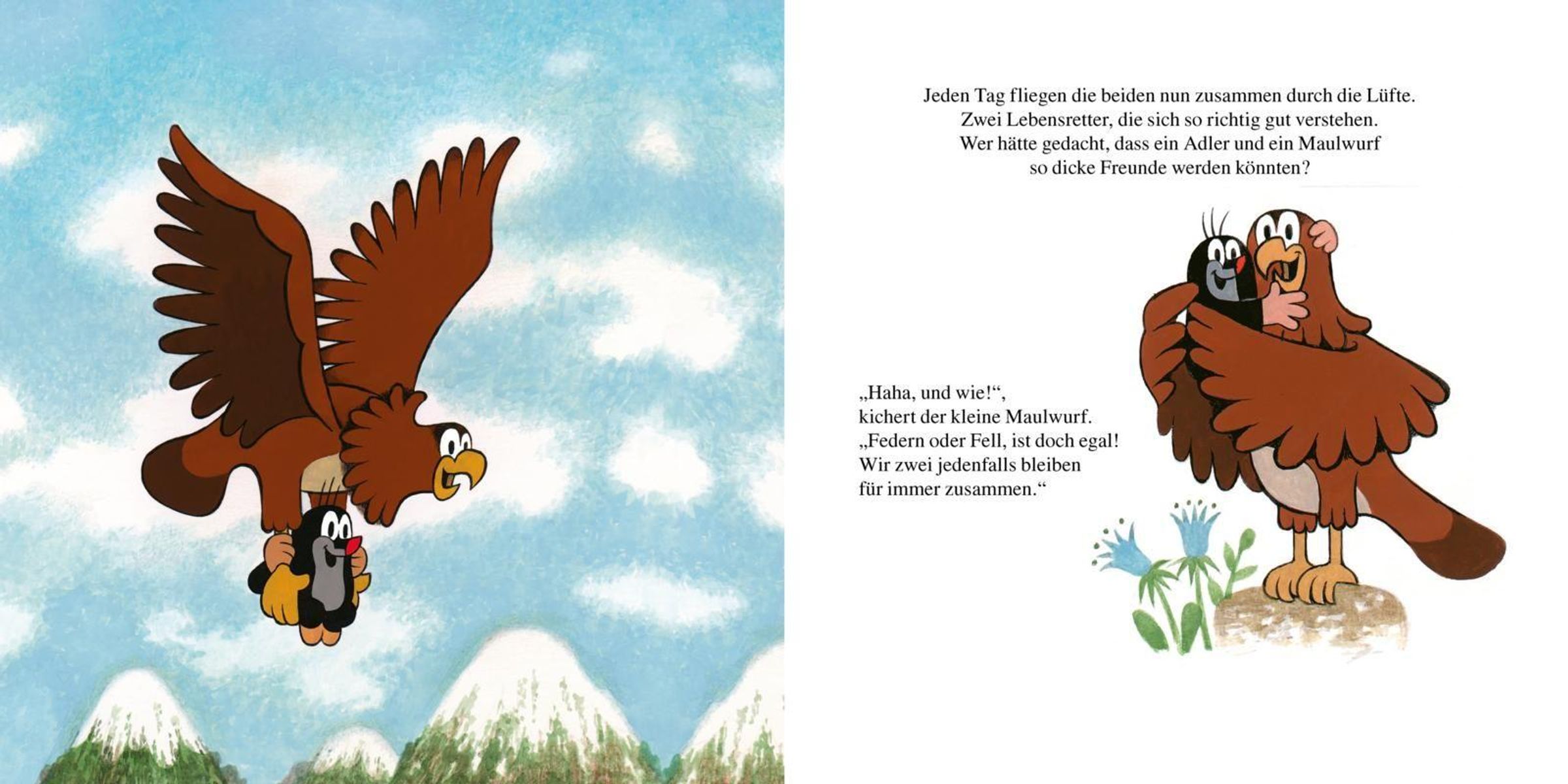 Für einen hilflosen kleinen Adler wird der sympathische Held zum Zieh-Papa. Dabei kann er nur staunen, wie groß doch der Hunger des kleinen Vogels ist und wie groß dieser Vogel nach kürzester Zeit selbst wird. Ein ausgewachsener Adler sollte natürlich fliegen können - nur, wie soll ein Maulwurf einem Vogel das Fliegen beibringen? Und können zwei so unterschiedliche Tiere überhaupt Freunde bleiben? Als der Fuchs vorbeischaut, ist der Maulwurf über seinen starken Gefährten jedenfalls mehr als glücklich: Der kleine Maulwurf und der Adler sind eben ein richtig gutes Team.