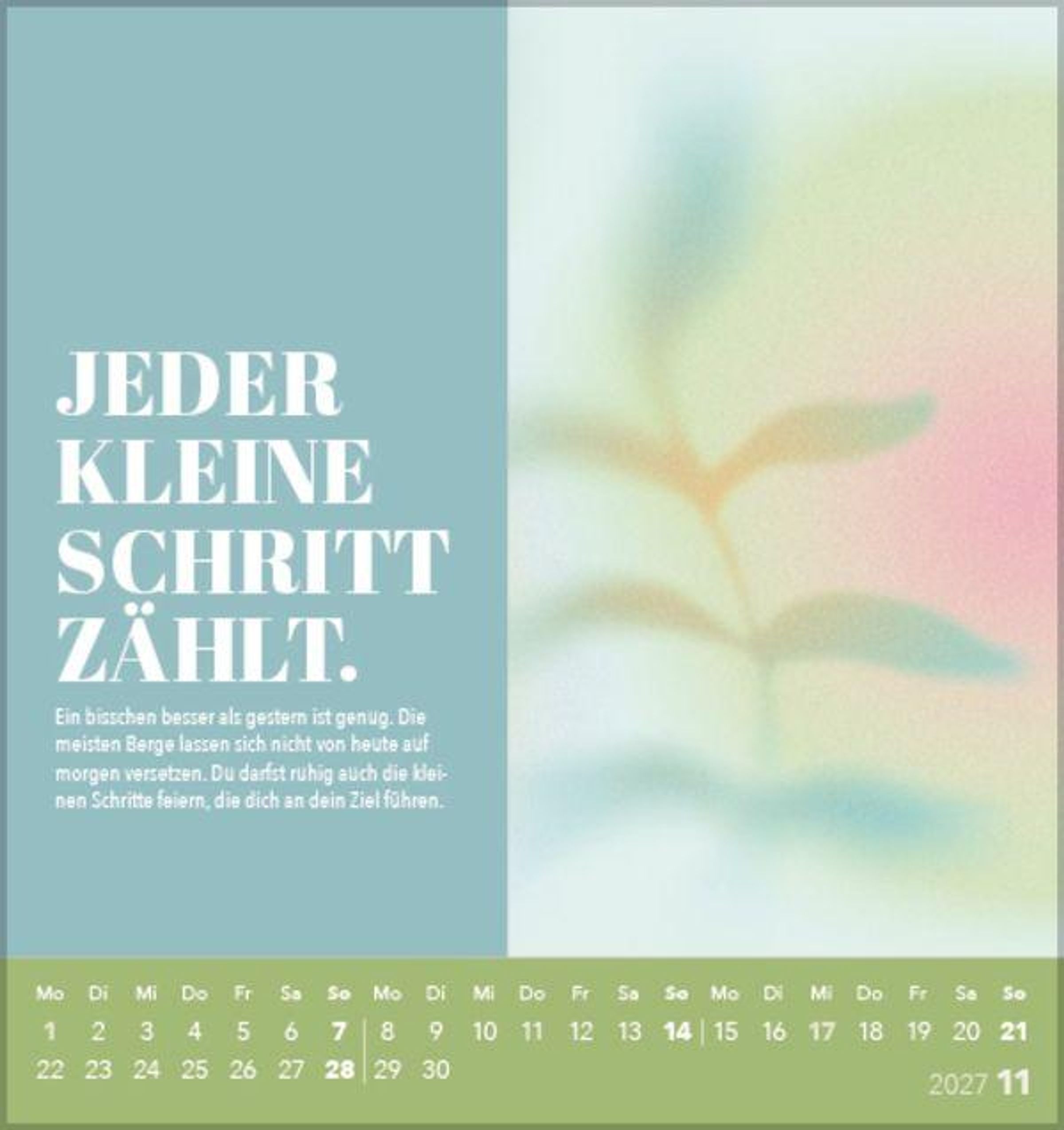 Jedes Kalenderblatt ist so gestaltet, dass es einfach abzutrennen ist. Somit können Sie jeden Monat eine Postkarte mit einem schönen Spruch versenden oder verschenken.