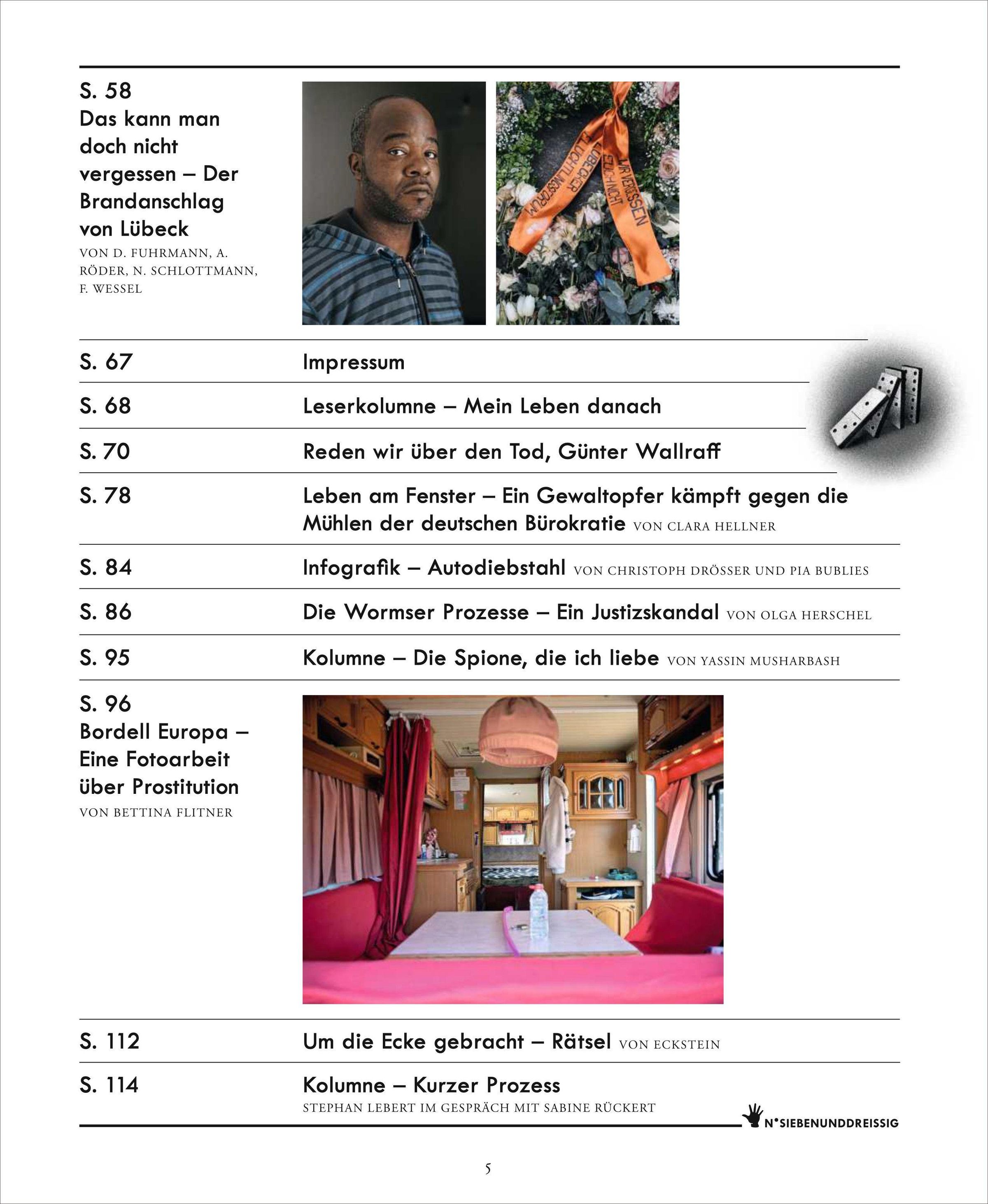 * Titelthema: Vom Arzt vergewaltigt: Ihr sollt wissen, was er uns angetan hat. * Der Diplomat - Ein deutscher Beamter gerät in Rio unter Mordverdacht * 'Leichen? Die zählen wir doch längst nicht mehr' - Treffen der Krimi-Königinnen * Wer macht denn so was? Vandalismus in Berghütten * Die Wormser Prozesse - Ein Justizskandal