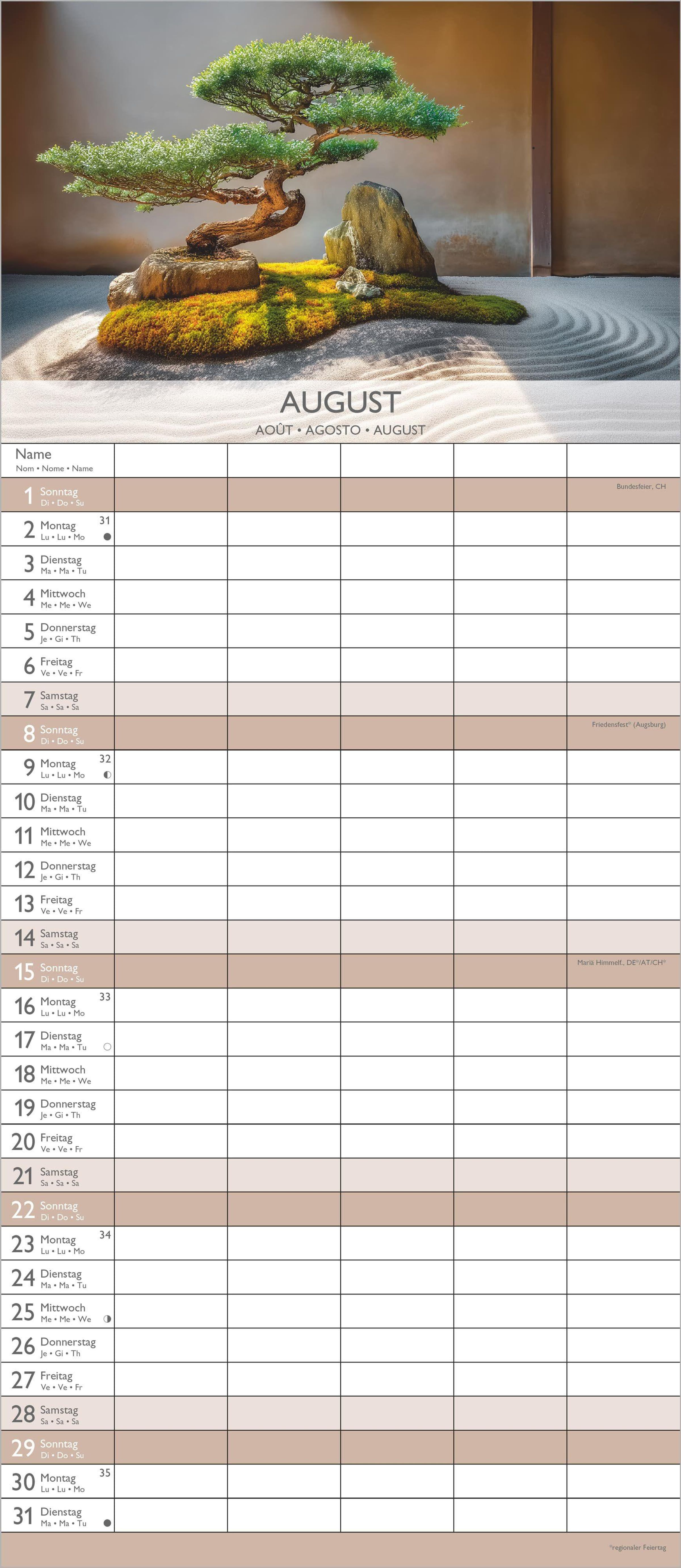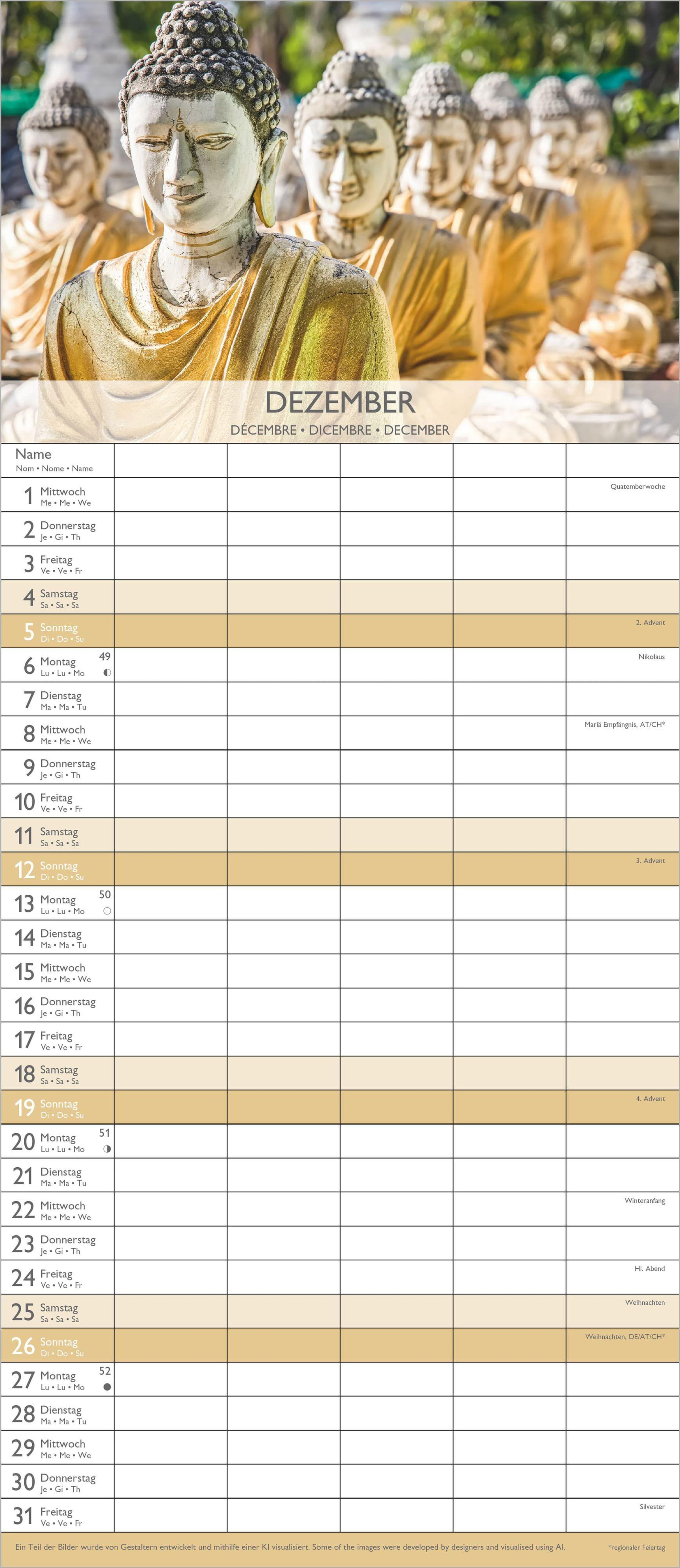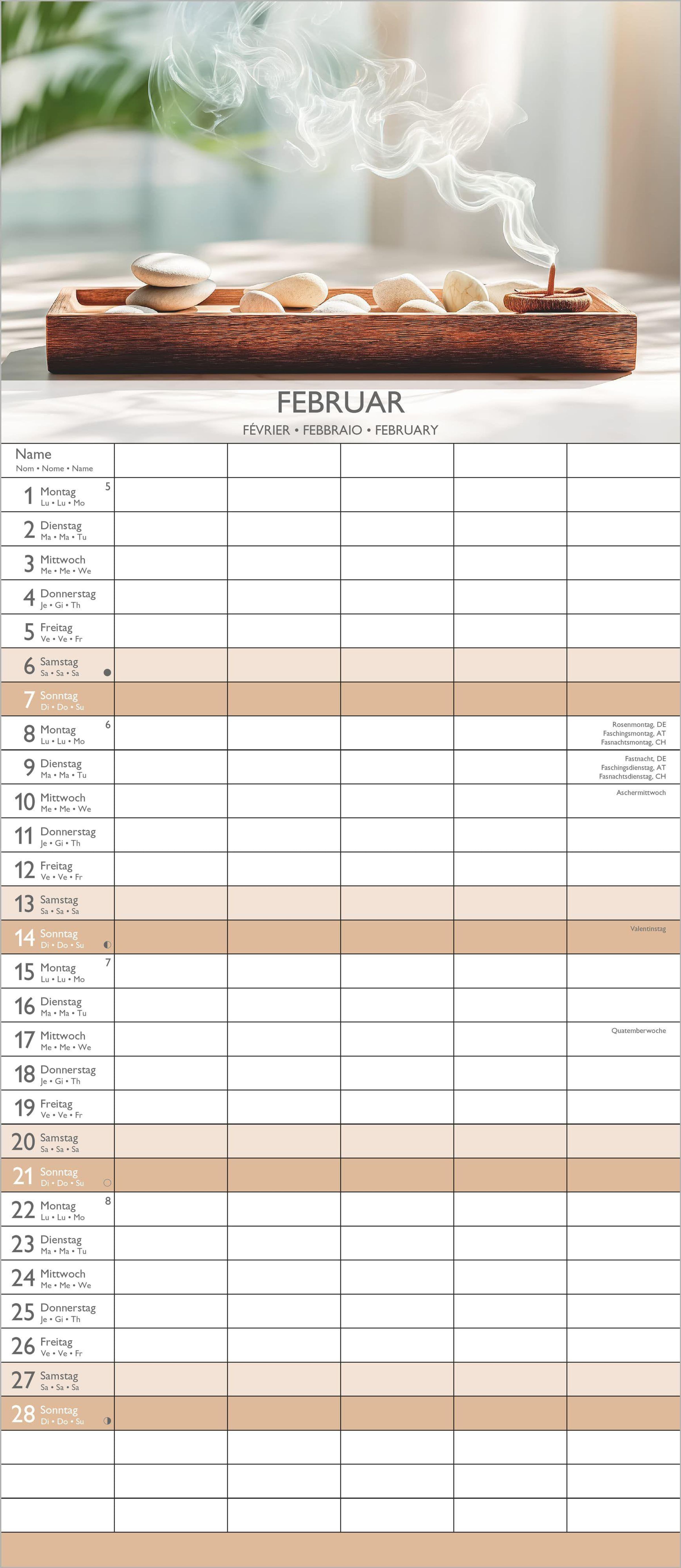 Kalenderseite 2027, "ZEN". Familienplaner mit Feiertagen. Foto: Orchideen, brennende Kerzen, Bambusmatte., Kalender