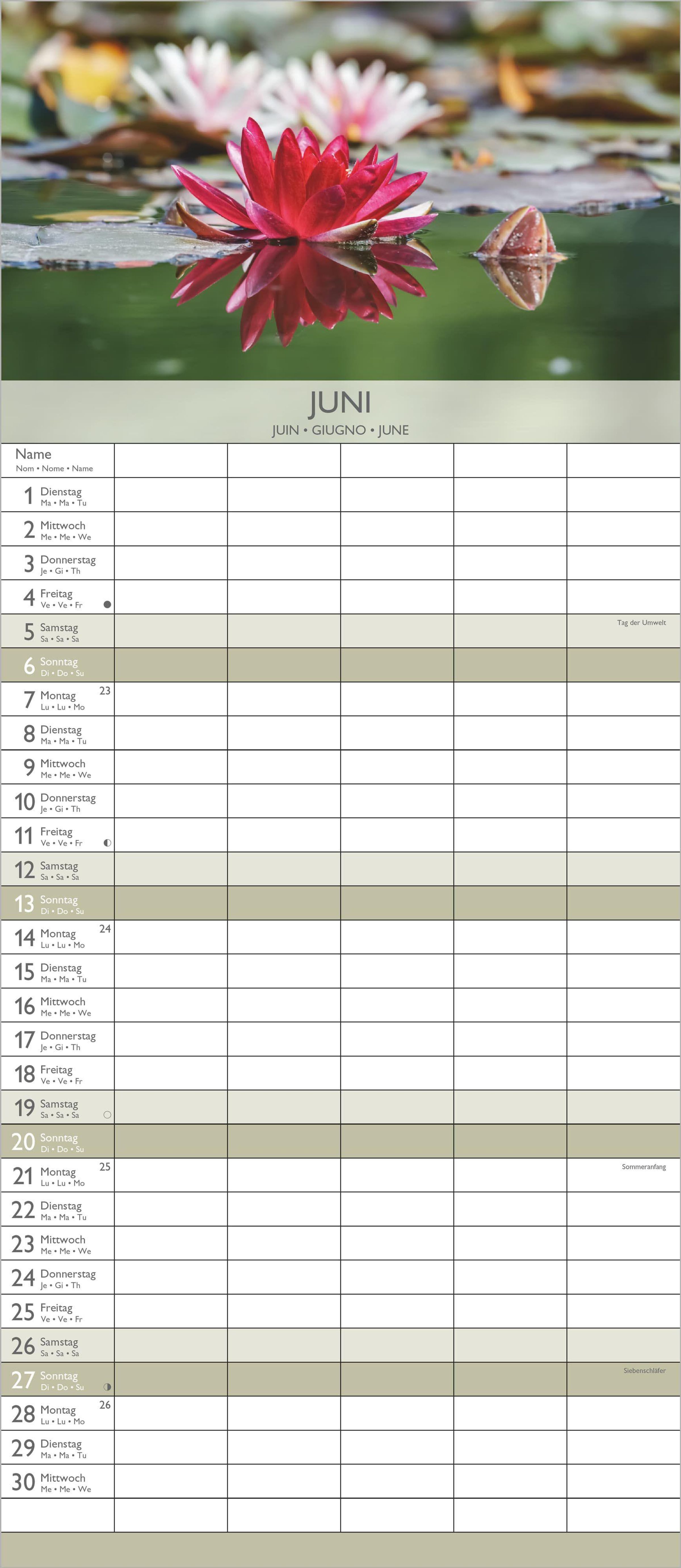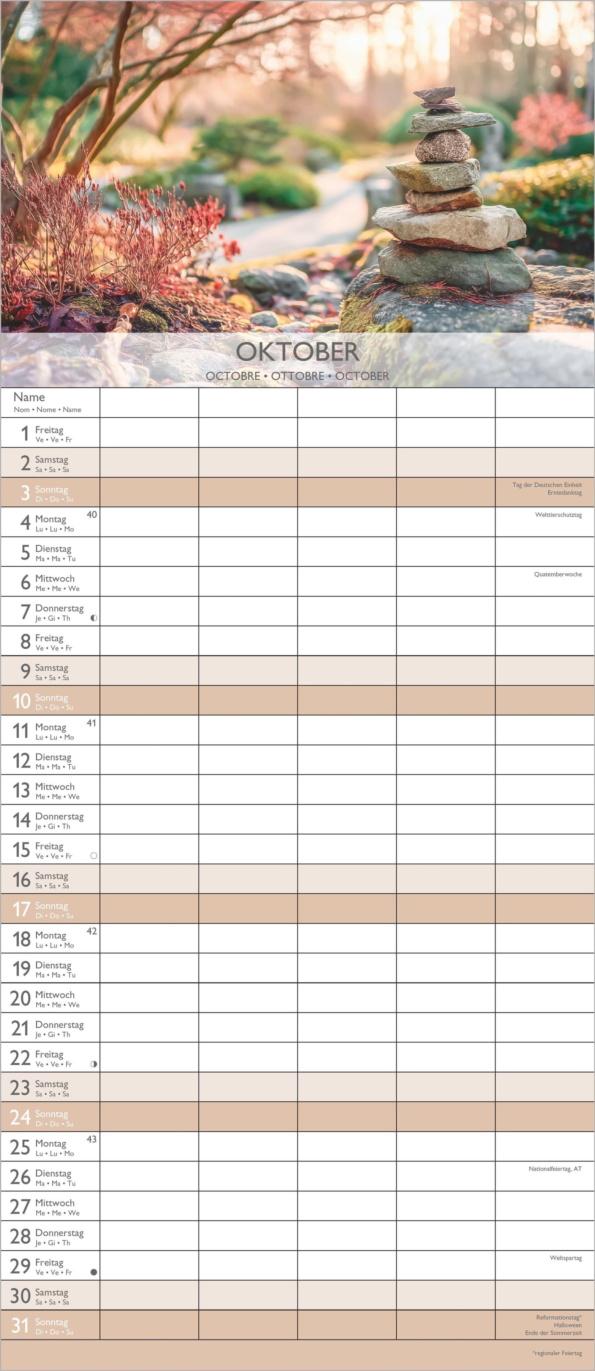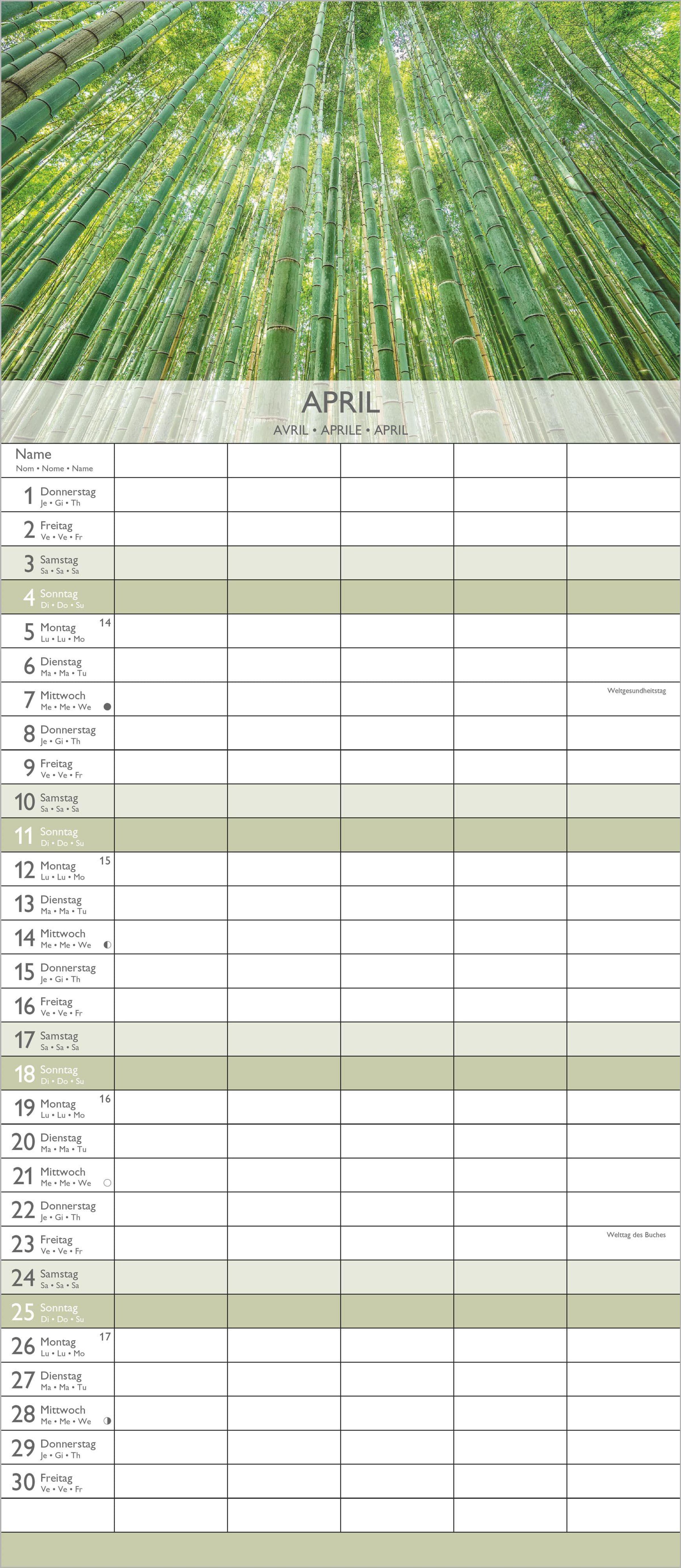 Kalenderseite 2027, "ZEN". Familienplaner mit Feiertagen. Foto: Orchideen, brennende Kerzen, Bambusmatte., Kalender