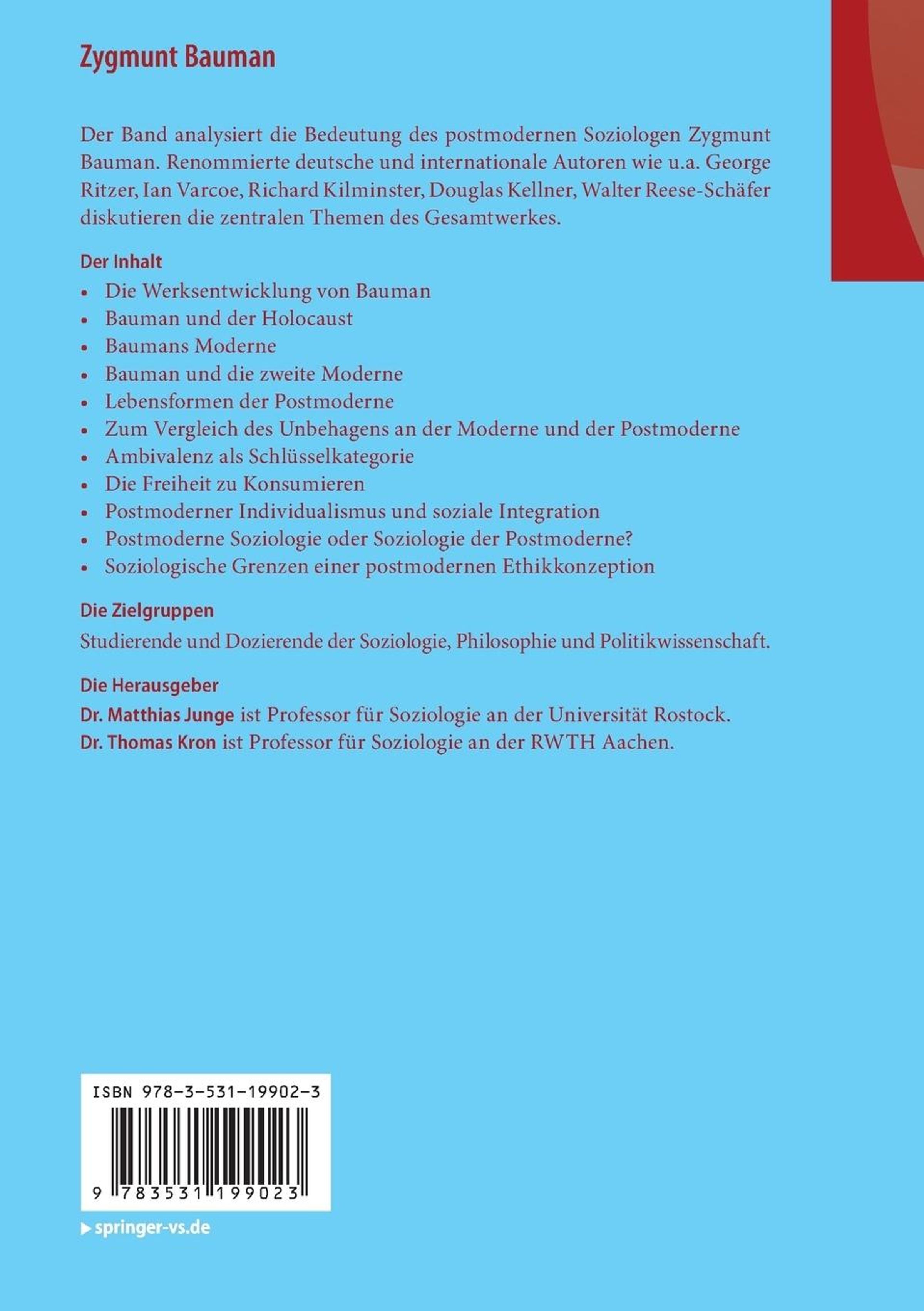 Der Band analysiert die Bedeutung des postmodernen Soziologen Zygmunt Bauman. Renommierte deutsche und internationale Autoren wie u. a. George Ritzer, Ian Varcoe, Richard Kilminster, Douglas Kellner, Walter Reese-Schäfer diskutieren die zentralen Themen des Gesamtwerkes.