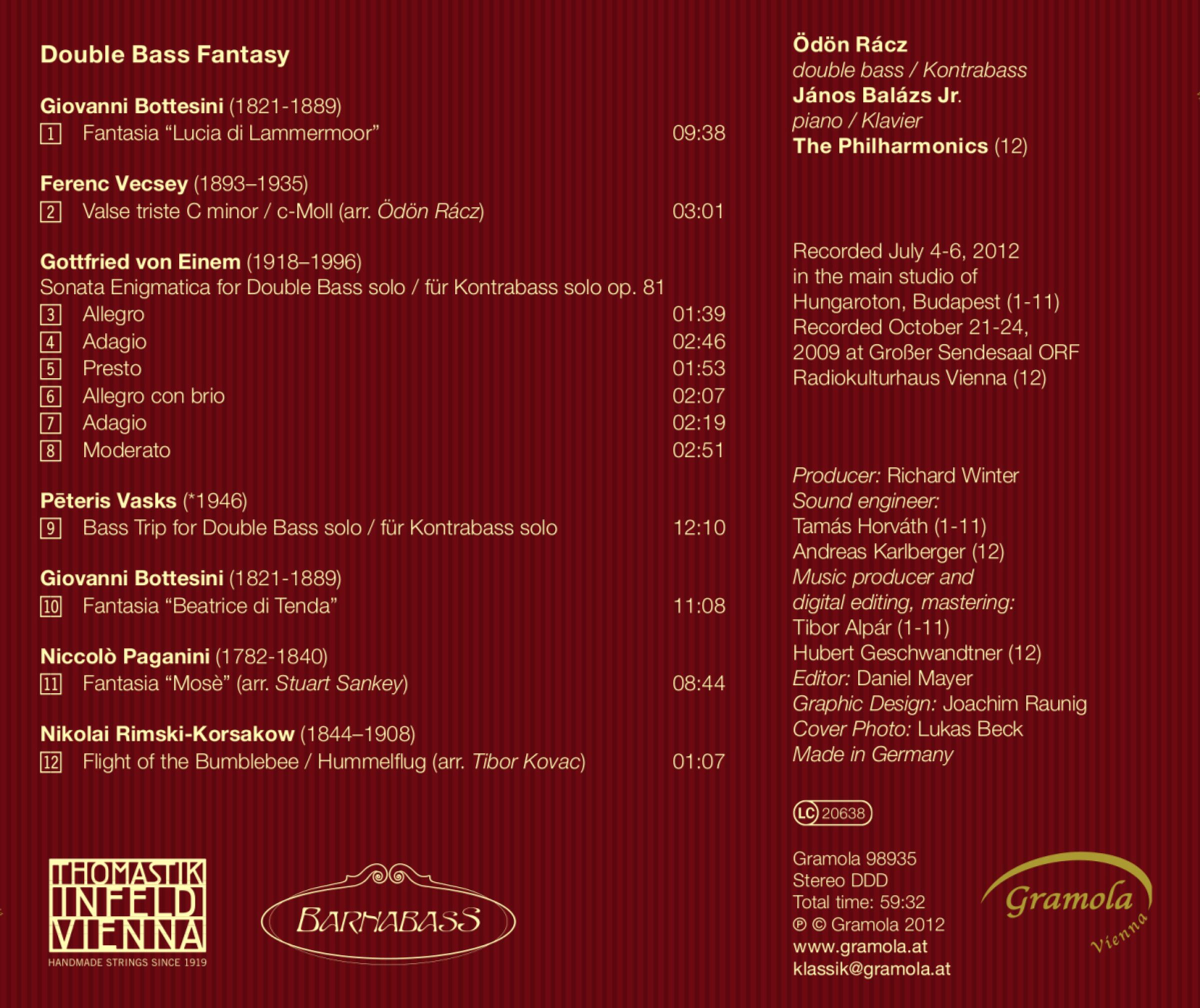 Der 1981 in Budapest geborene Solo-Kontrabassist der Wiener Philharmoniker, Ödön Rácz, glänzt auf dieser Neuerscheinung mit den von Giovanni Bottesini arrangierten Opernfantasien ,,Lucia di Lammermoor" und ,,Beatrice di Tenda" und der Fantasie über ein Thema aus der Oper ,,Moses" von Rossini von Niccolò Paganini. Ein weiteres, äußerst virtuoses Werk, das im Original für Violine verfasst wurde, ist der ,,Valse triste c-Moll" von Ferenc Vecsey. Später im 20. Jahrhundert verortet sind die ,,Sonata enigmatica" für Kontrabass solo von Gottfried von Einem und das Auftragswerk ,,Bass Trip", das 2003 für den ARD-Musikwettbewerb von dem Letten Peteris Vasks komponiert wurde. Bravour von seiner besten Seite, die durch das herausragende Spiel des Pianisten János Balázs Jr. seine Vollendung findet.
