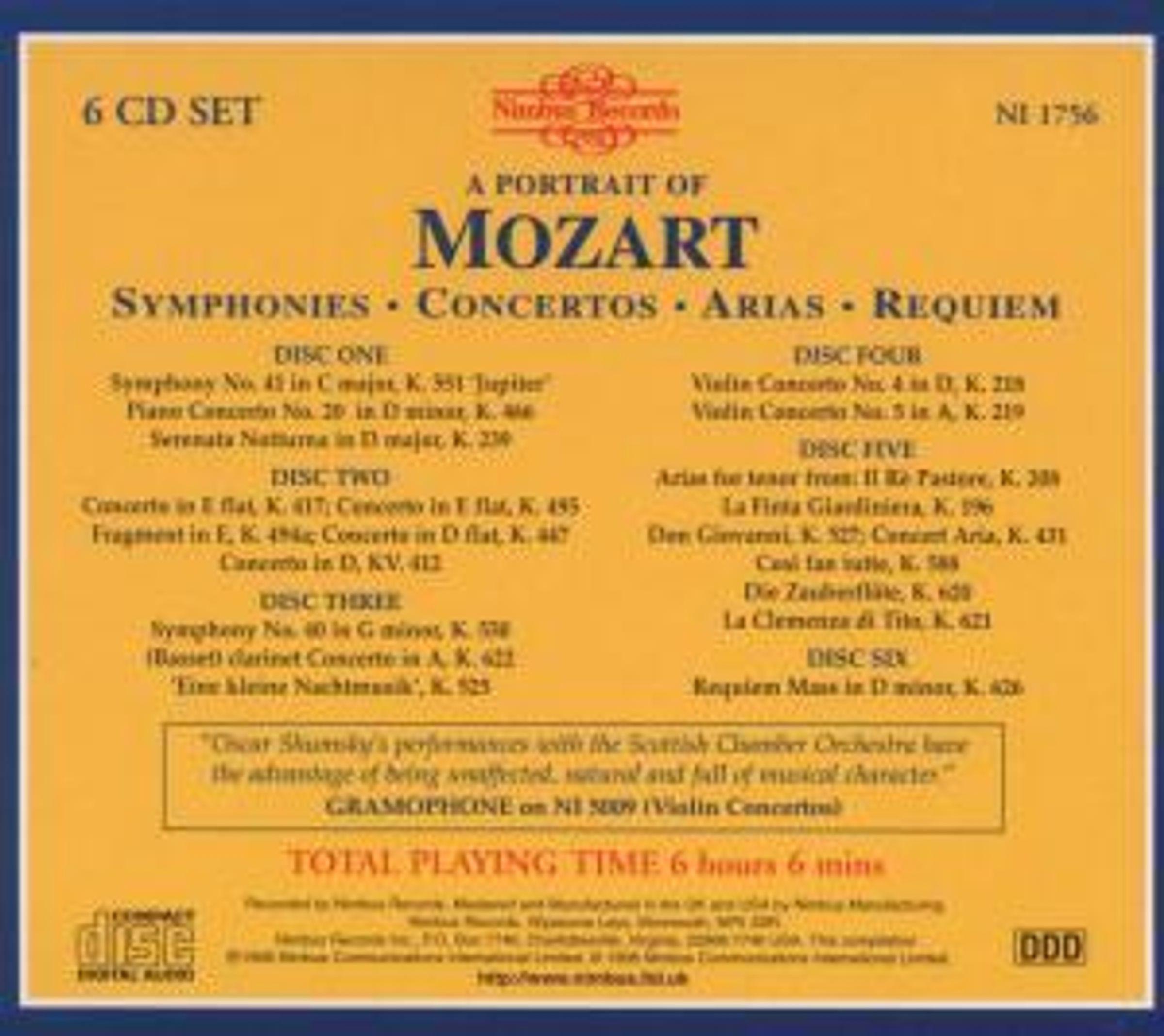 Symphonien Nr. 40 & 41; Serenaden Nr. 6 "Notturna" & Nr. 13 "Eine kleine Nachtmusik"; Klavierkonzert Nr. 20; Klarinettenkonzert KV 622; Hornkonzerte Nr. 1-4; Konzertsatz KV 494a für Horn & Orchester; Violinkonzerte Nr. 4 & 5; Tenorarien aus Il Re pastore KV 208, La Finta giardiniera KV 196, Don Govanni KV 527, Cosi fan tutte KV 588, Die Zauberflöte KV 620, La Clemenza di Tito KV 621; Konzertarie für Tenor KV 431; Requiem KV 626