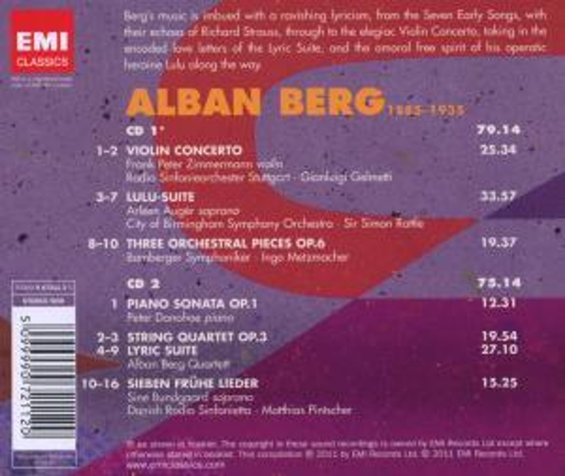 +Lulu-Suite; 3 Orchesterstücke op. 6; Klaviersonate op. 1; Streichquartett op. 3; Lyrische Suite für Streichquartett; 7 frühe Lieder