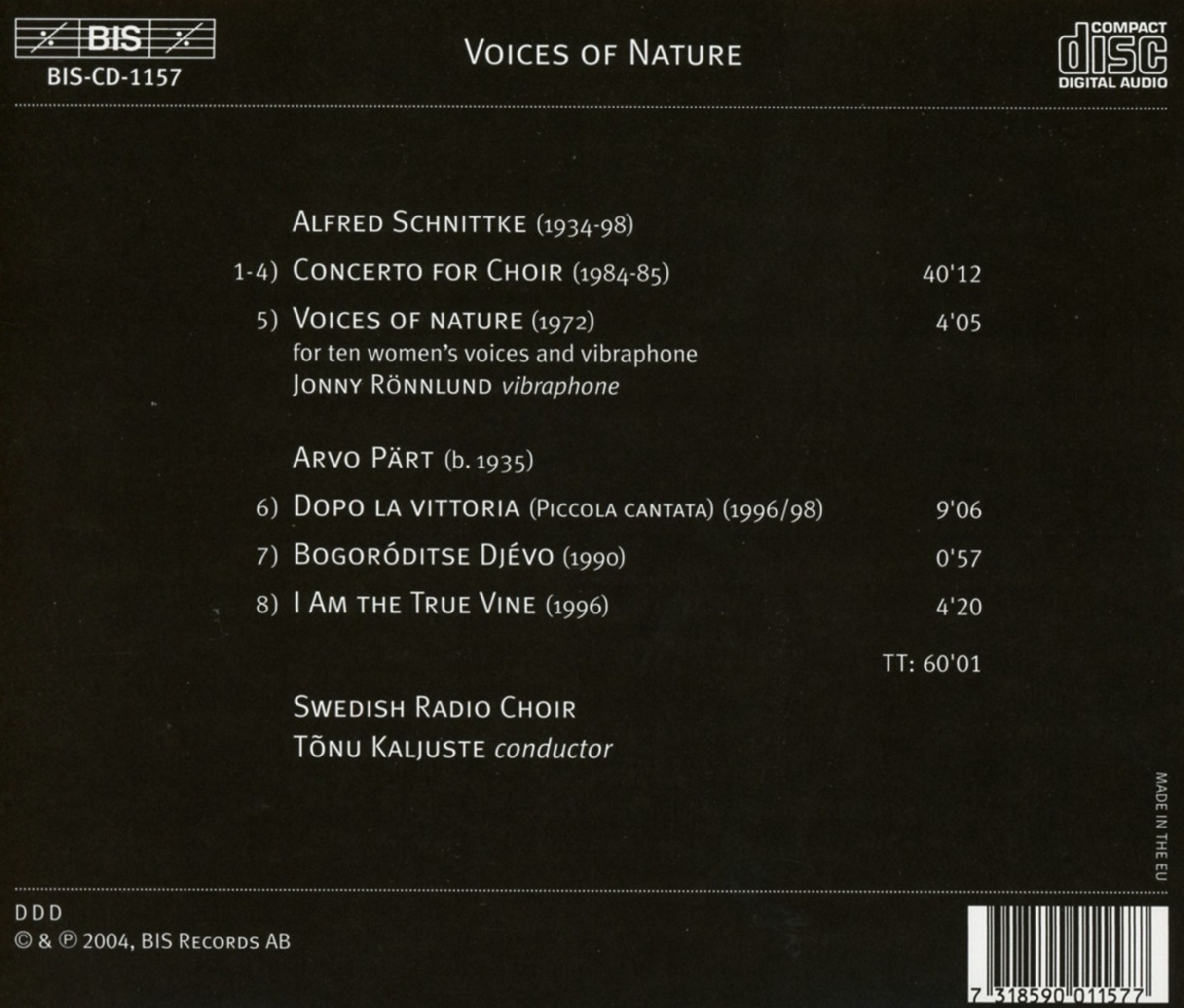 This success story began in 1952 when the legendary choir conductor Eric Ericson became principal conductor of the choir. When the Estonian conductor Tõnu Kaljuste became the choir's first non-Swedish principal conductor, he introduced the choir to new repertoire in a particularly exciting collaboration. It is the fruits of this we can enjoy on the present disc: three works on sacred themes by Kaljuste's compatriot Arvo Pärt (of which one, Dopo la vittoria, was dedicated to Kaljuste and the Swedish Radio Choir) and Alfred Schnittke's short Voices of Nature and monumental Concerto for Choir. Using texts by the 10th century Armenian mystic Gregory of Narek – in a Russian translation – the 40-minute long Concerto has become a classic in the modern repertoire for choir. In several ways the work invokes the music of the Russian Orthodox Church, and in fact, Schnittke was reluctant to publish the work outside of Russia, as he feared that non-Russian performances would lack religious intensity. But as anyone will know who has listened to the Swedish Radio Choir's previous BIS release (BIS-CD-1048), such fears would be groundless in the circumstances. The choir's interpretation of Bengt Hambræus's Apocalipsis was described as »breathtakingly exciting« by the critics – and their performance of the music of Schnittke and Pärt will surely make as big an impact. It is with great pride that BIS resumes the collaboration with the Swedish Radio Choir – with a recording of the Requiems by Duruflé and Fauré to look forward to!