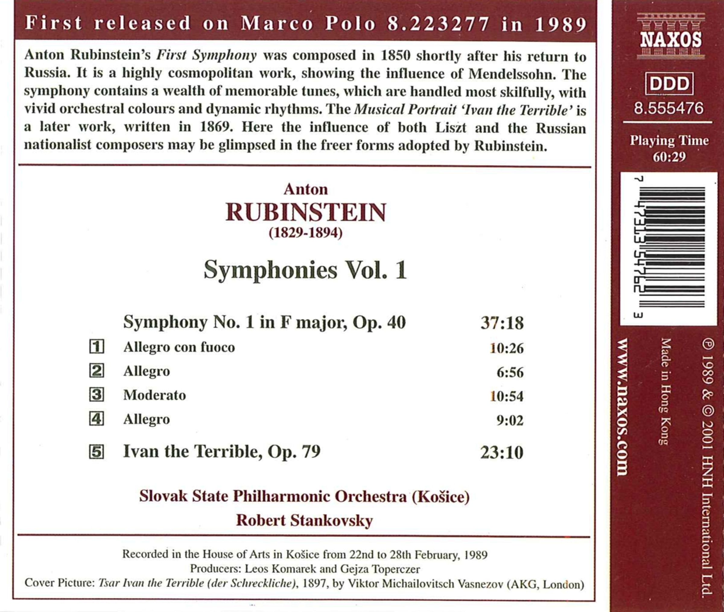 Rubinstein schrieb 1850 seine Sinfonie Nr. 1 F-Dur, Opus 40, im Jahr 1850. Das Werk ist somit ein Produkt der Zeit des fruchtbaren Studiums in St. Petersburg als Kammervirtuose der Großherzogin Elena Pawlowna, einer Zeit, in der er offensichtliche russische Einflüsse abgelehnt hatte, die später in seinem Leben einen relativ milden Ton anschlagen sollten. Die Sinfonie beginnt in feiner Mendelssohnscher Stimmung und widersetzt sich jeder Andeutung leichtfertiger Eile, ein Vorwurf, der später gegen ihn erhoben wurde. Vermutlich gehörte sie zu den vierzig oder fünfzig Kompositionen, die er vier Jahre später Liszt in Weimar zeigte. Für Liszt muss die formale Sinfonie eine untergegangene Gattung gewesen sein, so wie für Balakirew und seine Gruppe ein musikalisches Idiom von solch klassischer Reinheit ein Gräuel gewesen sein muss. Die Sinfonie ist in der Tat reiner Mendelssohn, und sie entstand, wie man sich erinnern mag, nur drei Jahre nach dem frühen Tod dieses Komponisten.