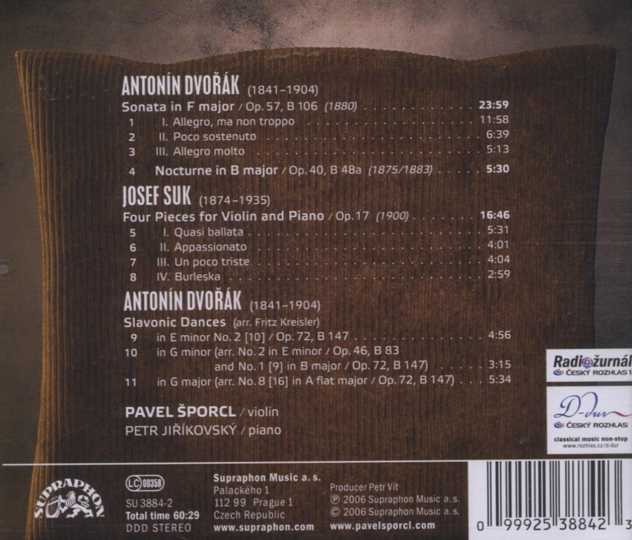 Pavel Sporcl, having released his first Dvorak CD last year, presents a second album of Dvorak pieces for violin and piano, choosing the Sonata, the miniature Nocturne, and especially the virtuoso Slavonic Dances transcribed for violin and piano by the legendary violin maestro Fritz Kreisler. Sporcl makes full use of all of the possibilities offered by the Dvorak pieces both from the standpoint of violin performance as well as from the standpoint of sheer musicality; his Dvorak is full of color and nuance. The Dvorak repertoire is complemented by Josef Suk's well-known composition Four Pieces for Violin and Piano, Op. 17. Here as well, Sporcl makes the most of the material. His invaluable partner at the piano is accompanist Petr Jirikovsky. This recording is sure to impress listeners with Sporcl's technical skill and sensitive interpretation of the Czech repertoire.