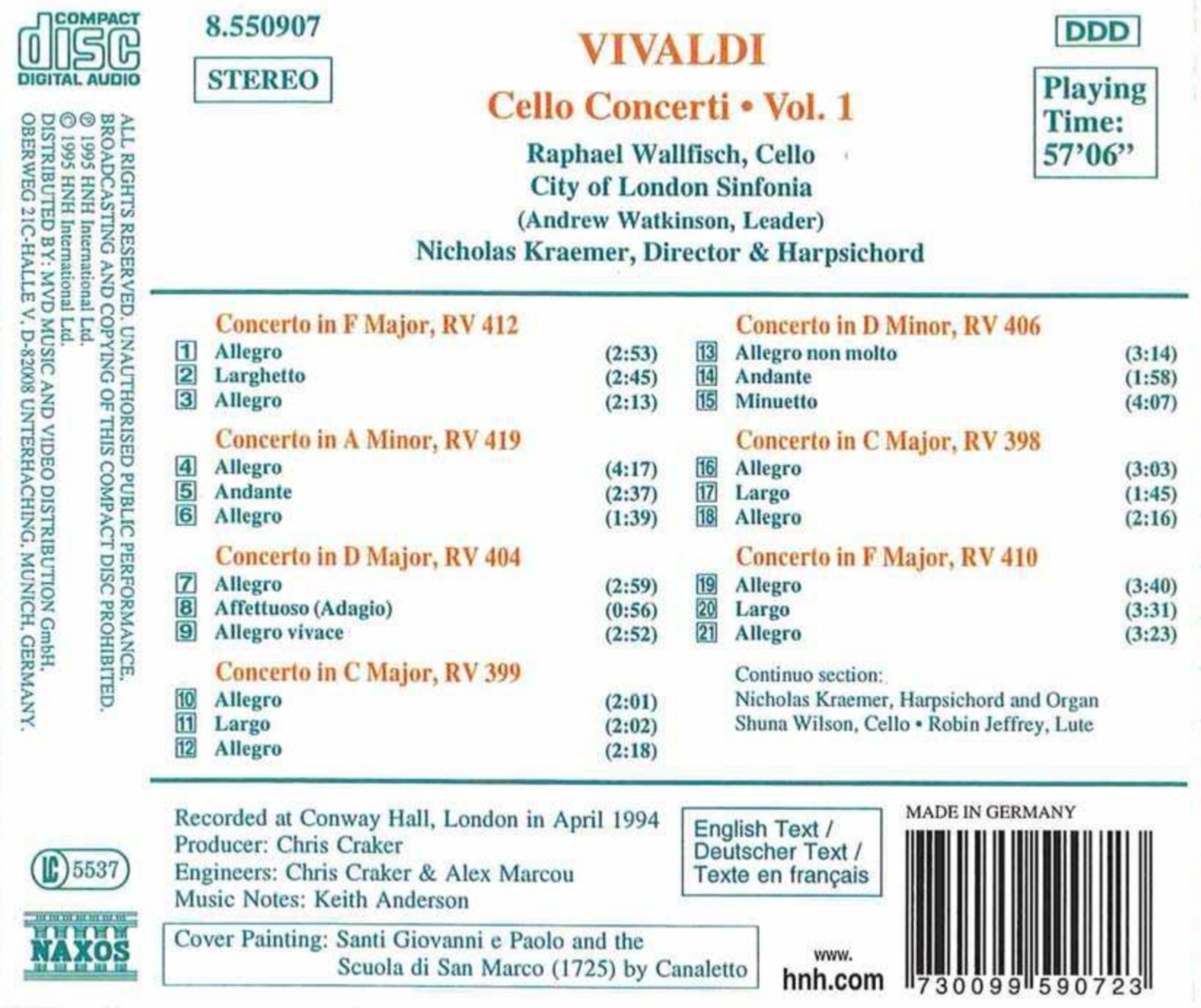 Three of the concertos surviving in the Schönborn library at Wiesentheid are included on the present compact disc. The first of these, the Concerto in G minor, RV 416, starts with a ritornello based on the ascending and descending scale, used to frame the more varied solo entries. The slow movement Adagio, in the same key, is an aria for cello and basso continuo and is followed by a final Allegro in triple metre, with a series of solo entries that start with semiquaver (sixteenth note) figuration, going on to triplet quavers (eighth notes) and to a third solo entry with wide spaced intervals.