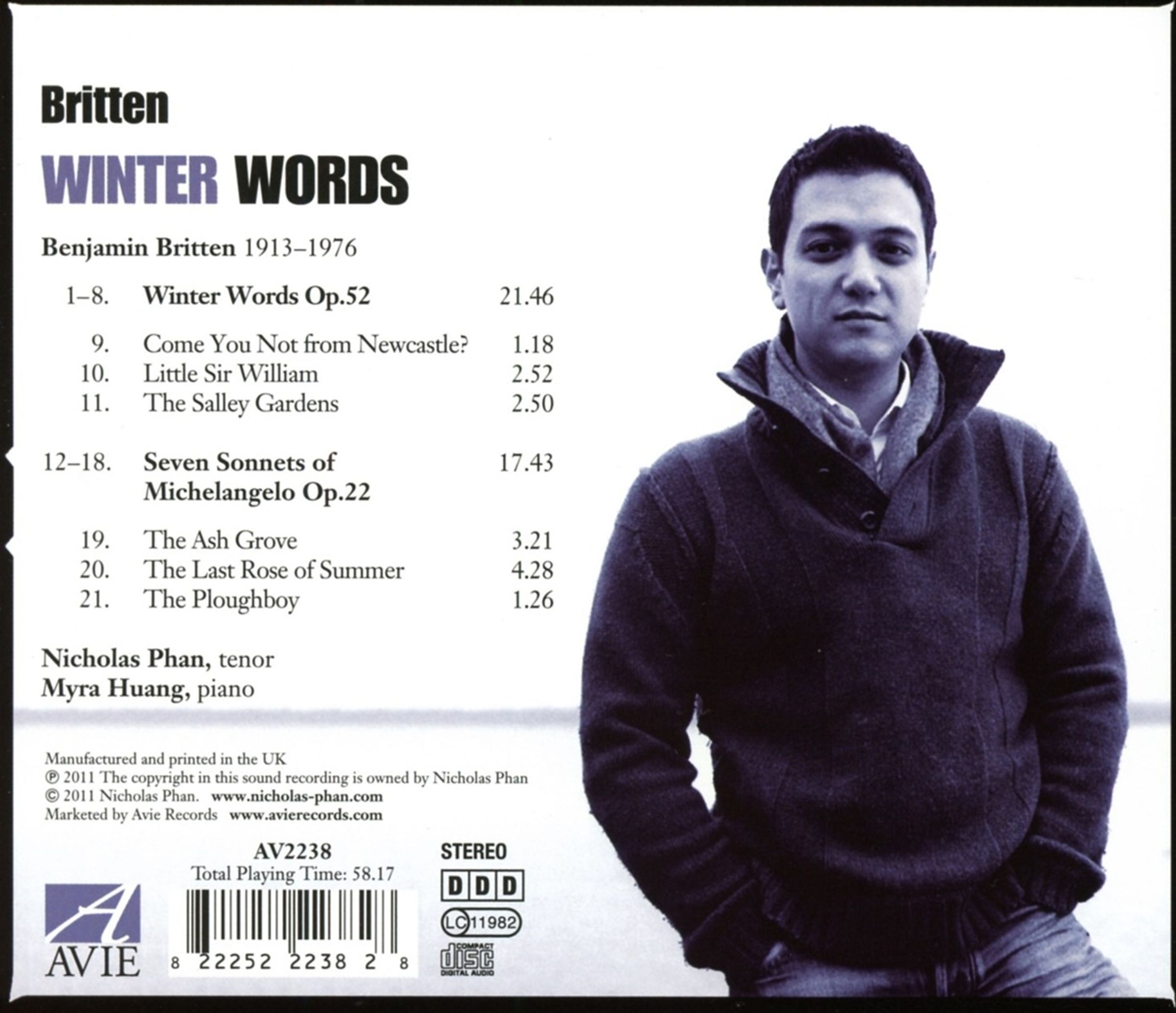 Winter Words ist das Solo-Debüt des amerikanischen Tenors Nicholas Phan. Die Aufnahme entstand im Anschluss an eine Konzerttournee 2010 / 11, die in seinem Carnegie-Debüt in der Weill Hall gipfelte. Als Absolvent der Manhattan School of Music und Absolvent des Houston Grand Opera Studios trat Nick mit den Opernhäusern von Los Angeles und Seattle, Symphonieorchestern von Atlanta, St. Louis und San Francisco sowie den Festivals Marlboro, Ravinia und Edinburgh auf , unter anderen. Er sang Strawinskys Pulcinella mit dem Chicago Symphony Orchestra unter Pierre Boulez, das für einen Grammy Award nominiert wurde.