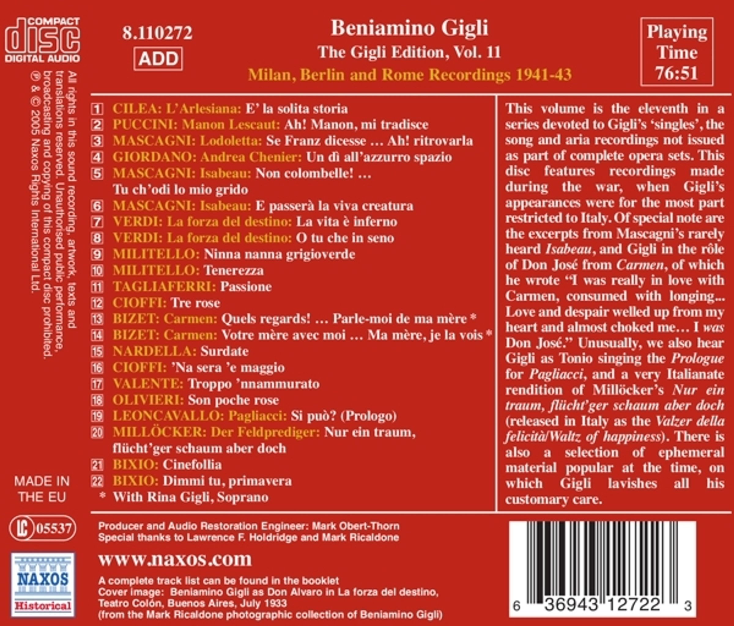 (The Milan, Berlin & Rome Recordings 1941-1943) Lieder & Arien von Cilea, Puccini, Mascagni, Giordano, Verdi, Militello, Tagliaferri, Cioffi, Bizet, Nardella, Valente, Olivieri, Leoncavallo, Millöcker, Bixio