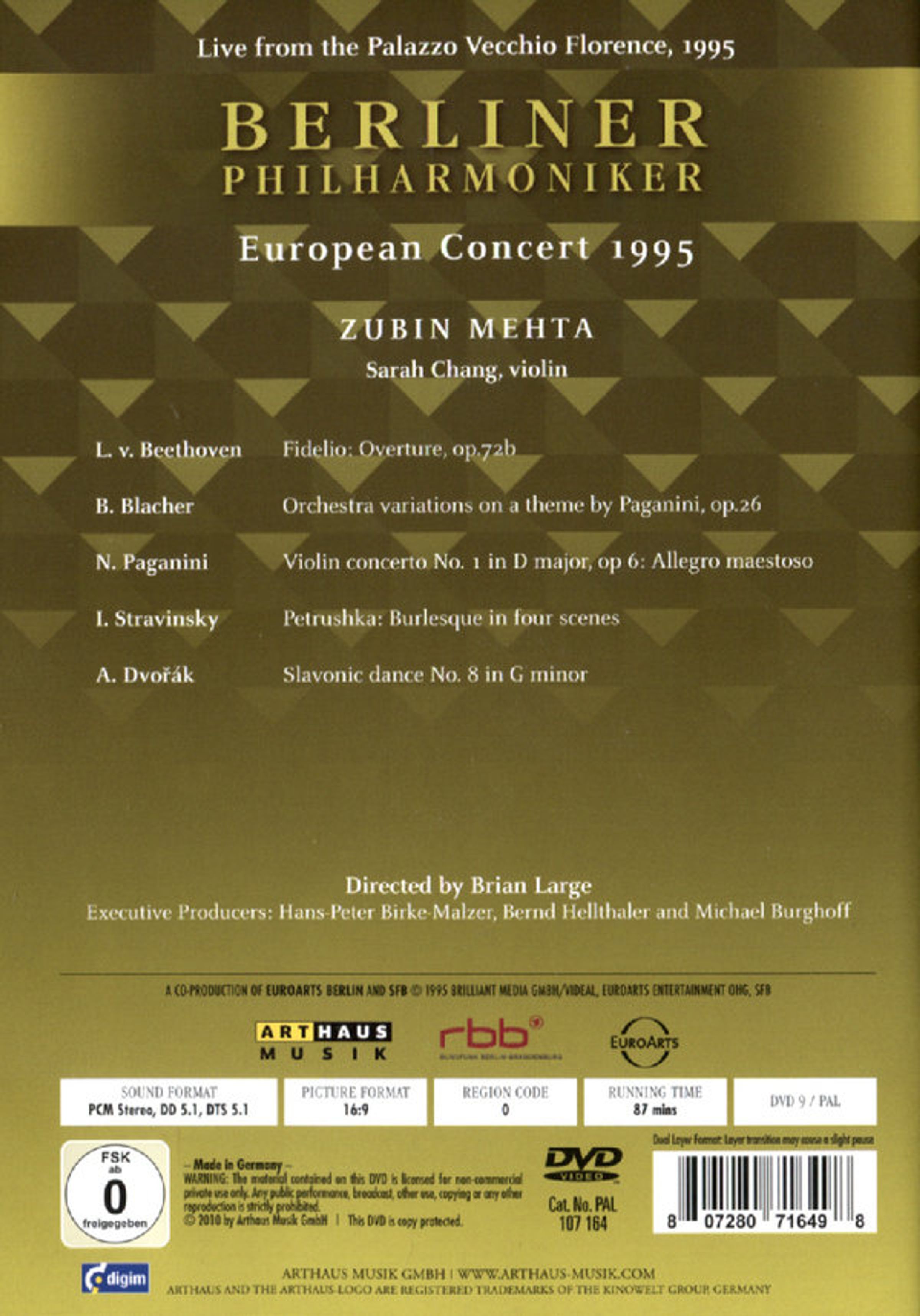 Die berühmte florentinische Medici-Residenz ist Schauplatz des 5. Europakonzertes der Berliner Philharmoniker. Unter Maestro Zubin Mehta umrahmen Beethovens Ouvertüre zu Fidelio, Igor Strawinskys Petruschka und Dvoráks Slawischer Tanz Paganinis Violinkonzert Nr. 1, das von Sarah Chang, der gefeierten Solistin des Abends virtuos interpretiert wird.