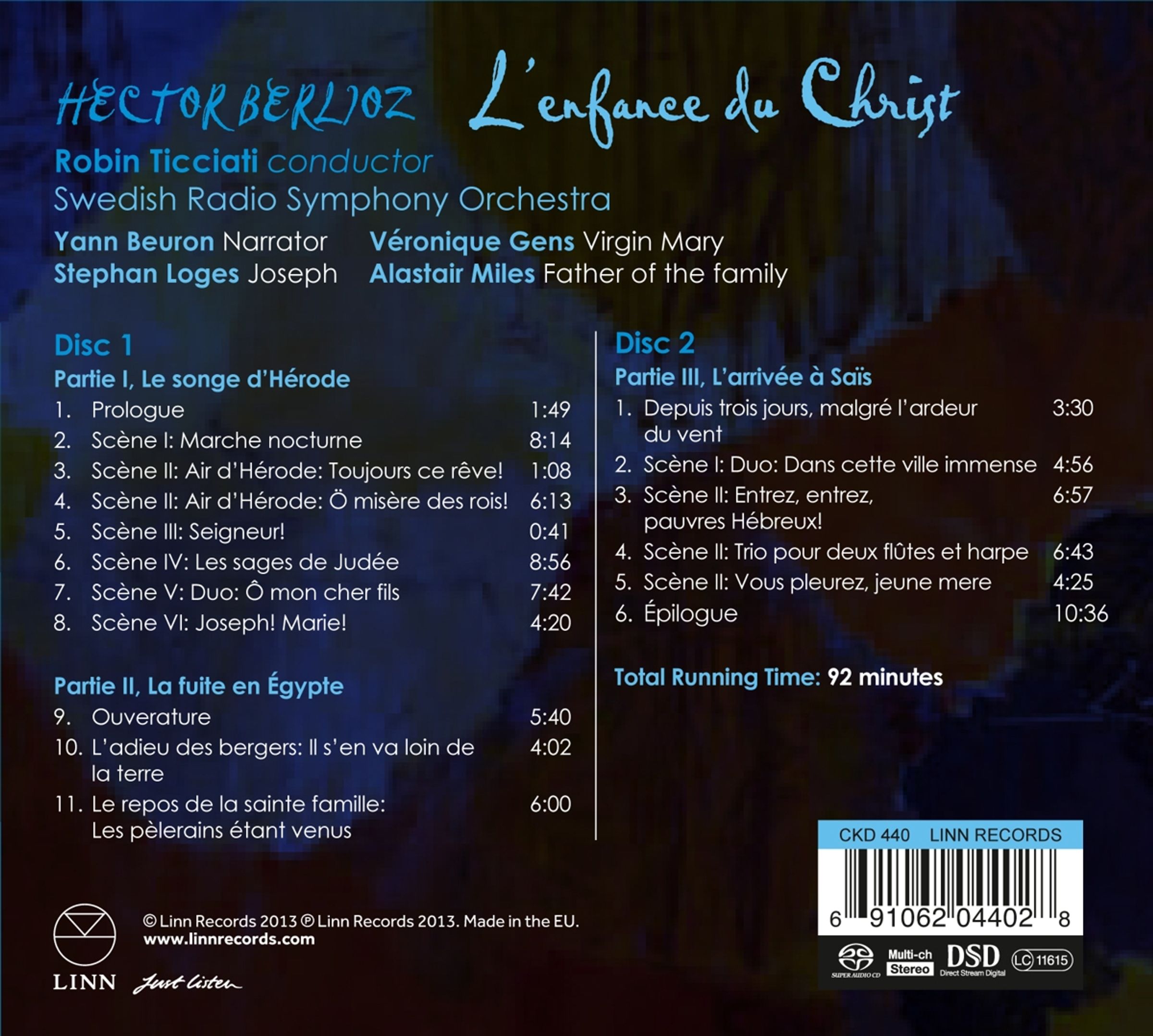 ,,Robin Ticciati, der sich bereits mit zwei Berlioz-Einspielungen mit dem Scottish Chamber Orchestra als versierter Berlioz-Interpret eingeführt hat, doppelt nun mit ,,L'enfance du Christ" nach, eingespielt in Stockholm. Seine Affinität zu Berlioz ist in jedem Takt spürbar, und Chor und Orchester des Schwedischen Rundfunks exzellieren in klangschöner Tongebung." (FONO FORUM, April 2014)Disk 1 von 2 (SACD)