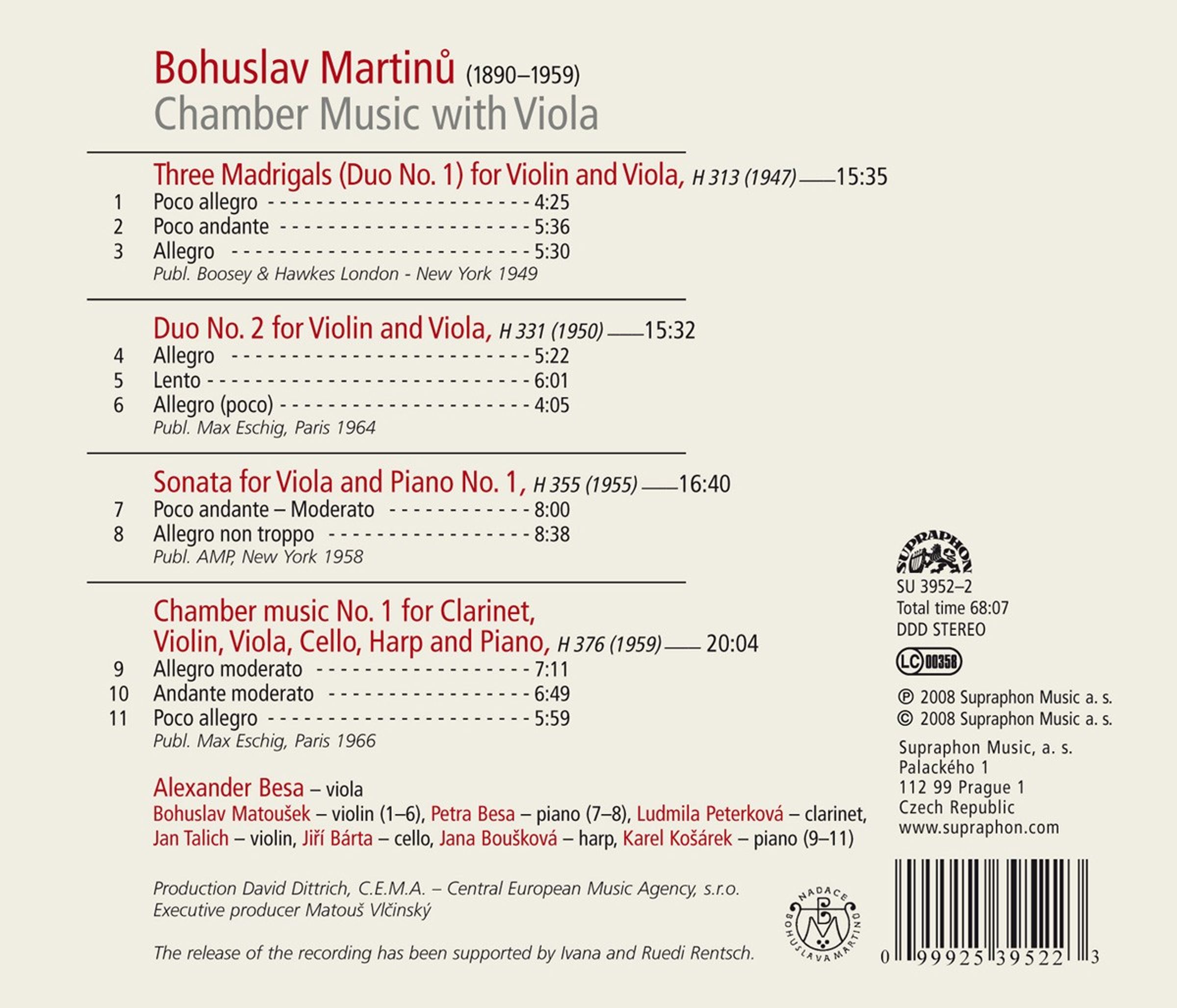 Duos für Violine & Viola Nr. 1 & 2; Sonate für Viola & Klavier Nr. 1; Kammermusik Nr. 1 für Klarinette, Violine, Viola, Cello, Harfe & Klavier