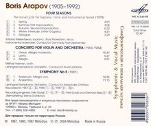The vocal cycle for soprano, tenor and instrumental nonet "Four seasons" is created in 1978 on verses of the Japanese poetry hokku (haiku). This genre of the Japanese poetry represents three unrhymed lines and consists of seventeen syllables (5~7-5). The challenge that Arapov faced was considerable, - the composer was to find a balance between freedom, ease of statement and precision of the constant metric structure peculiar to this poetic form.