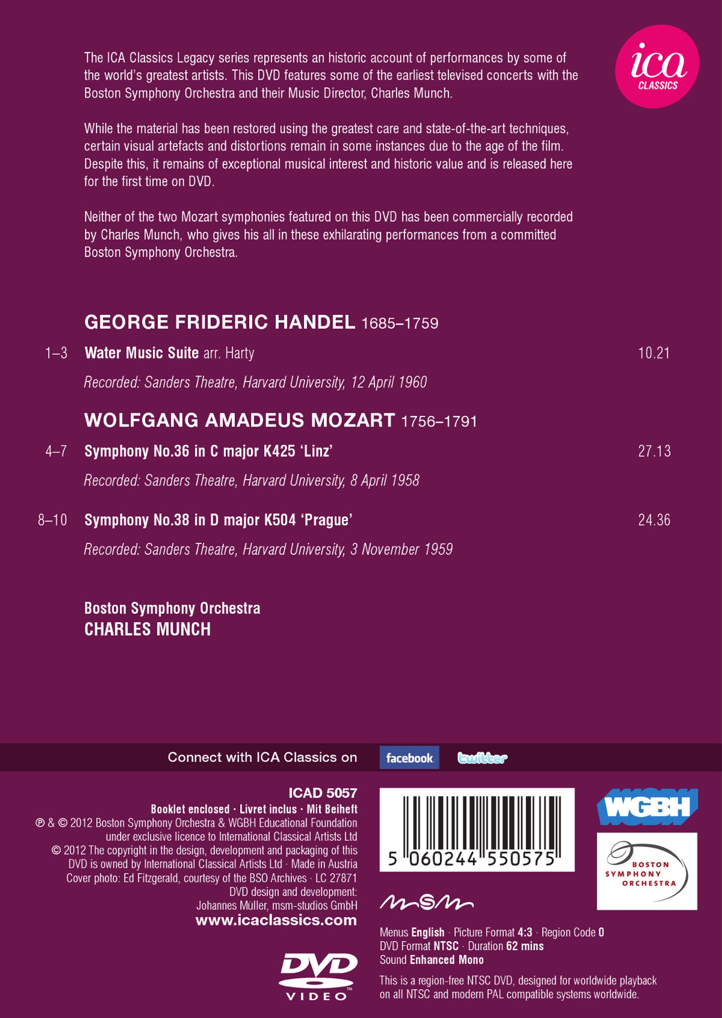 Munch war nie besonders für seinen Mozart bekannt, aber es ist dennoch überraschend, dass er mit dem BSO nur von zwei Werken Mozarts kommerzielle Aufnahmen machte, obwohl er die »Prager« und »Linzer« Symphonien ein paar Mal dirigierte. Seine erste Flötistin, Doriot Anthony Dwyer (die erste Frau, die in einem amerikanischen Orchester eine erste Position, abgesehen von der Harfe, innehatte), sah sich kürzlich Teile dieser Sendung an und sagte: »Er hat alles gut gemacht; er war ein starker Musiker, also war sein Mozart natürlich gut.« Auf die Frage, was sie jemandem, der sein Dirigat noch nie gehört hatte, über Munch sagen würde, hatte sie nur zwei Worte parat: »Vorsicht!«