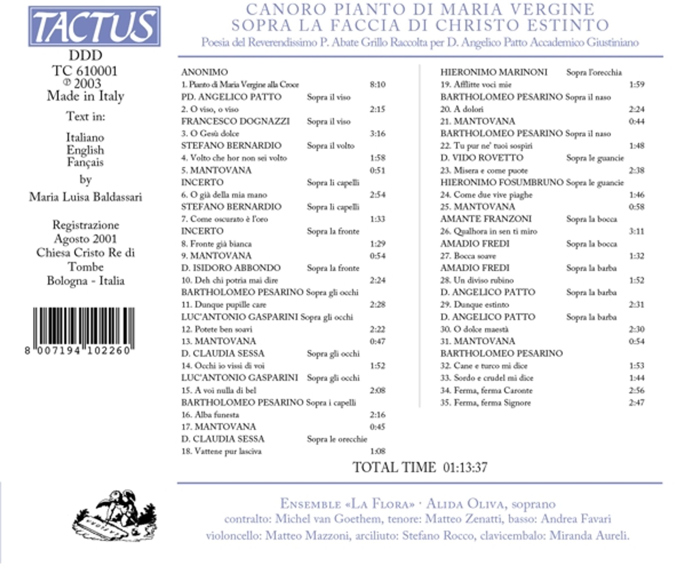 Das 1613 in Venedig veröffentlichte Canoro Pianto di Maria Vergine sopra la faccia di Christo Estinto ist eine Sammlung von Werken, die nach einer recht beliebten musikalischen Praxis des frühen Seicento entstanden: Ein Herausgeber, Musiker oder Dichter rief eine Reihe bekannter Komponisten zusammen, mit denen er verbunden war, und beteiligte sie an einem gemeinsamen literarischen Projekt.