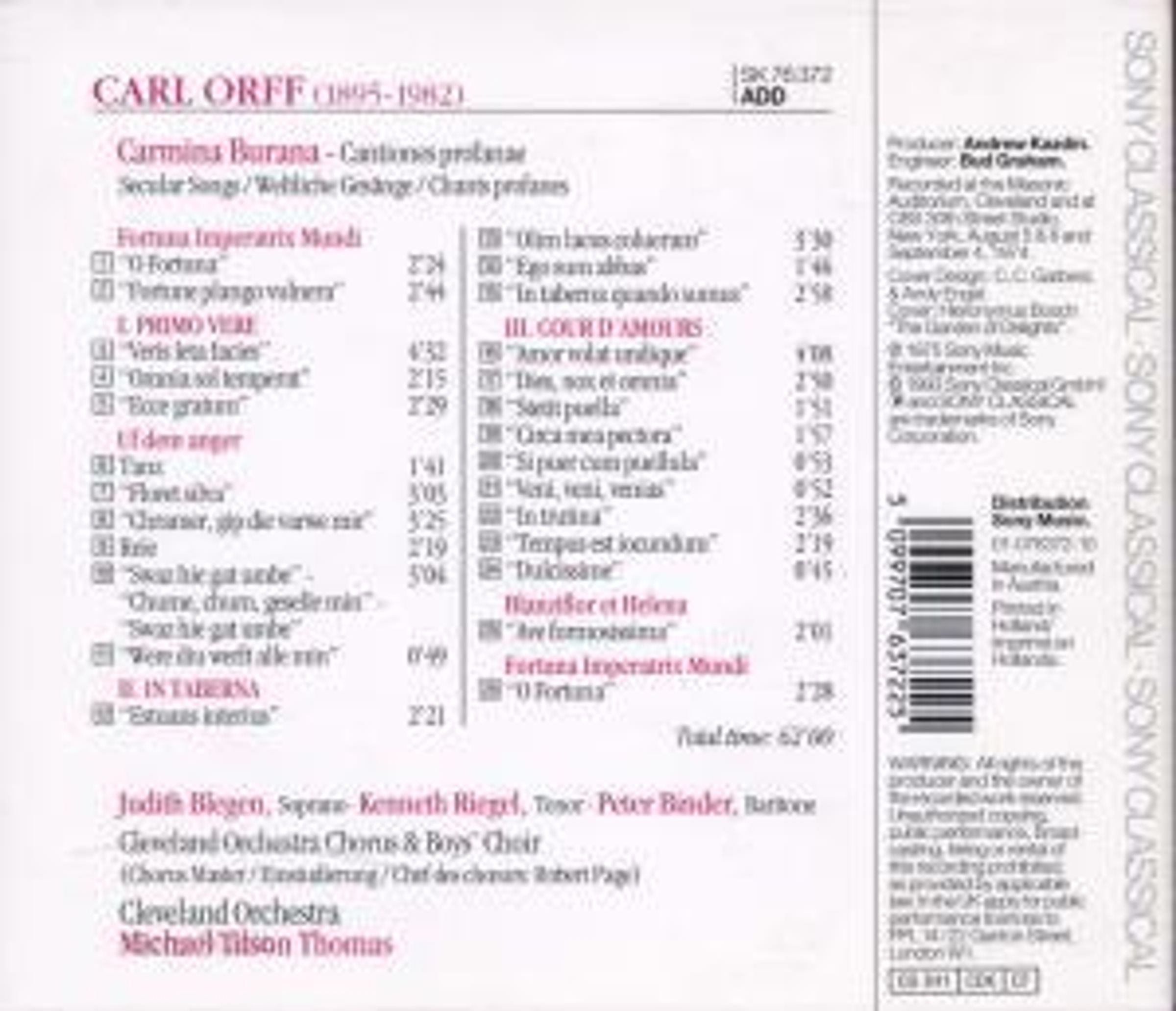 Carmina Burana - Weltliche Gesänge (Gesa ; O Fortuna (Fortuna Imperatix Mundi) 02: 24; Fortune Plango Vulnera 02: 44; Veris Leta Facies (Primo Vere) 04: 31; Omnia Sol Temperat 02: 14; Ecce Gratum 02: 29; Tanz (Uf Dem Anger) 01: 40; Floret Silva 03: 03; Chramer, Gip Die Varwe Mir 03: 25; Tilson-Thomas, M./Blegen / Riegel ;